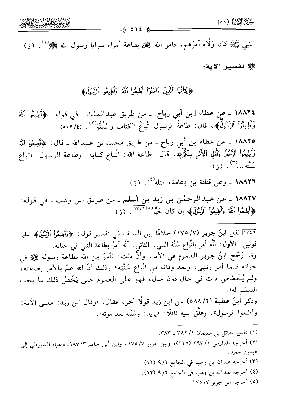 ١٨٨٢٤ - عن عطاء [بن أبي رباح]-من طريق عبد الملك- في قوله: {أطيعوا الله وأطيعوا الرسول}، قال: طاعةُ الرسول اتِّباعُ الكتاب والسُّنَّةِ (¬٢). (٤/ ٥٠٢)