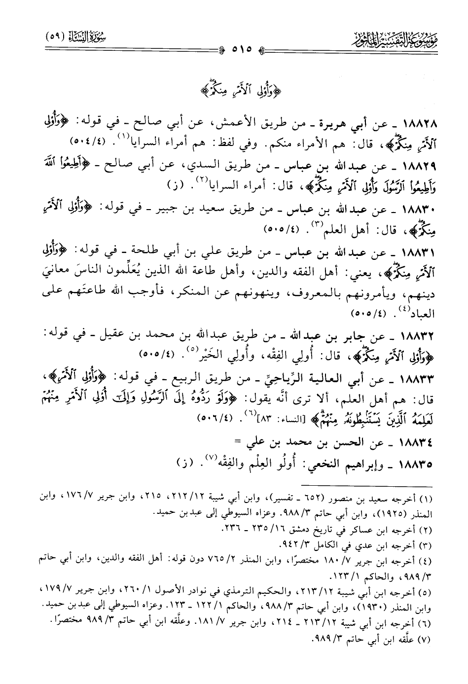 ١٨٨٣٣ - عن أبي العالية الرِّياحِيِّ -من طريق الربيع- في قوله: {وأولي الأمر}، قال: هم أهل العلم، ألا ترى أنّه يقول: {ولو ردوه إلى الرسول وإلى أولي الأمر منهم لعلم الذين يستنبطونه منهم} [النساء: ٨٣] (¬٦). (٤/ ٥٠٦)