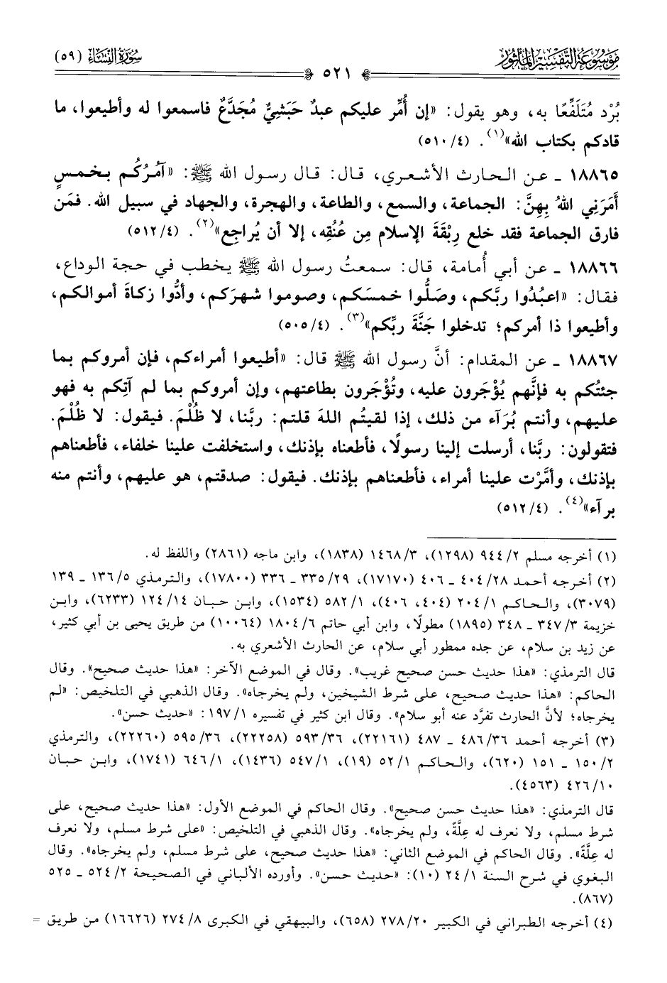 ١٨٨٦٥ - عن الحارث الأشعري، قال: قال رسول الله - صلى الله عليه وسلم -: «آمُرُكُم بخمسٍ أمَرَنِي اللهُ بِهِنَّ: الجماعة، والسمع، والطاعة، والهجرة، والجهاد في سبيل الله. فمَن فارق الجماعة فقد خلع رِبْقَةَ الإسلام مِن عُنُقِه، إلا أن يُراجِع» (¬٢).