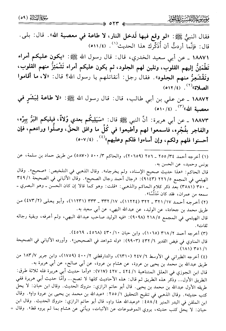 ١٨٨٧٢ - عن علي بن أبي طالب، قال: قال رسول الله - صلى الله عليه وسلم -: «لا طاعة لِبَشَرٍ في معصية الله» (¬٣).