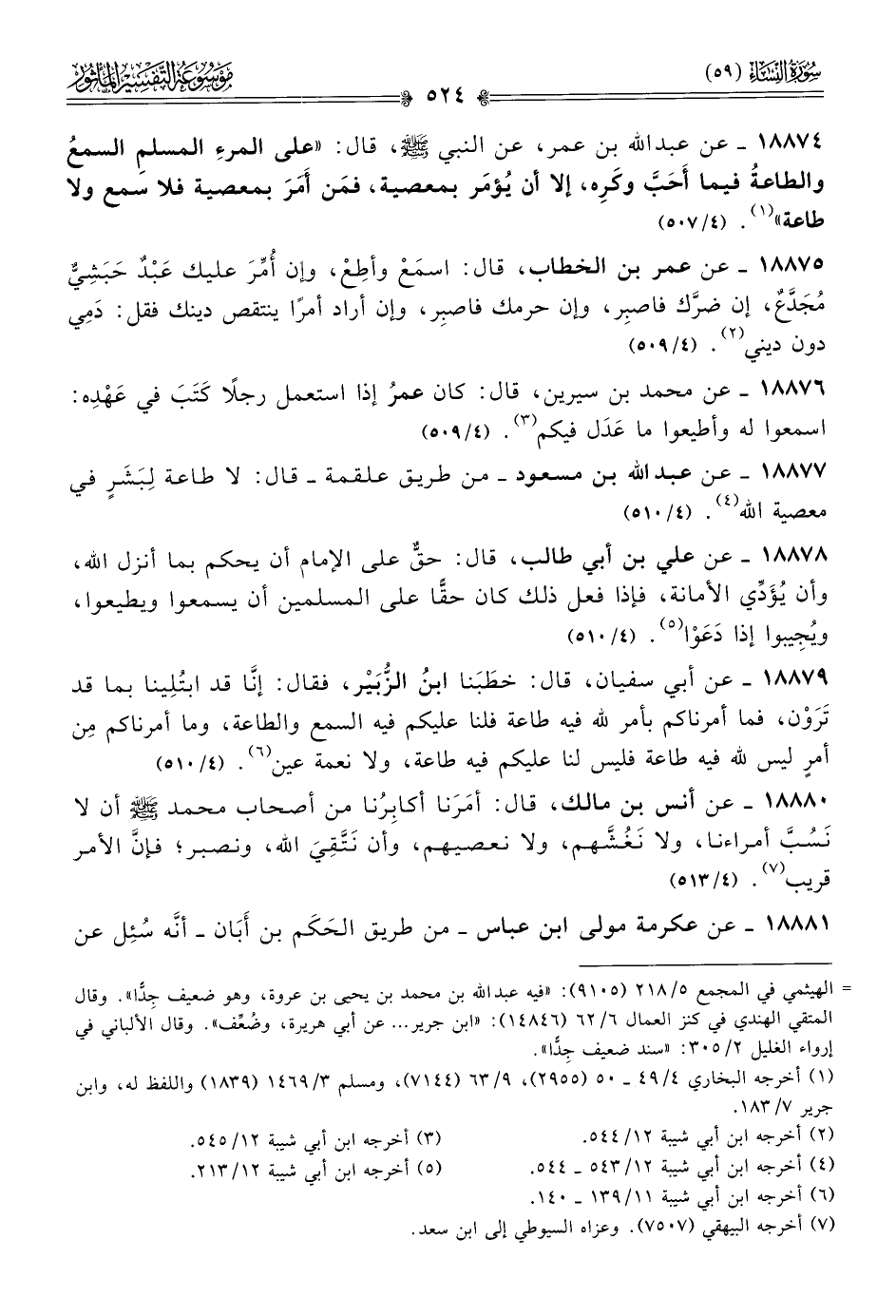 ١٨٨٧٧ - عن عبد الله بن مسعود -من طريق علقمة- قال: لا طاعة لِبَشَرٍ في معصية الله (¬٤). (٤/ ٥١٠)