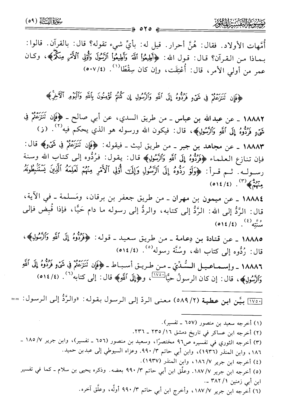 [١٧٥٠] بيَّن ابن عطية (٢/ ٥٨٩) معنى الردّ إلى الرسول بقوله: «والرَّدُّ إلى الرسول: هو سؤاله في حياته، والنظر في سنته بعد وفاته - صلى الله عليه وسلم -، هذا قول مجاهد، والأعمش، وقتادة، والسدي، وهو الصحيح». ولم يذكر مستندًا. ثم ذكر قولًا آخر: أنّ الرد إلى الله ورسوله معناه: «قولوا: الله ورسوله أعلم».
