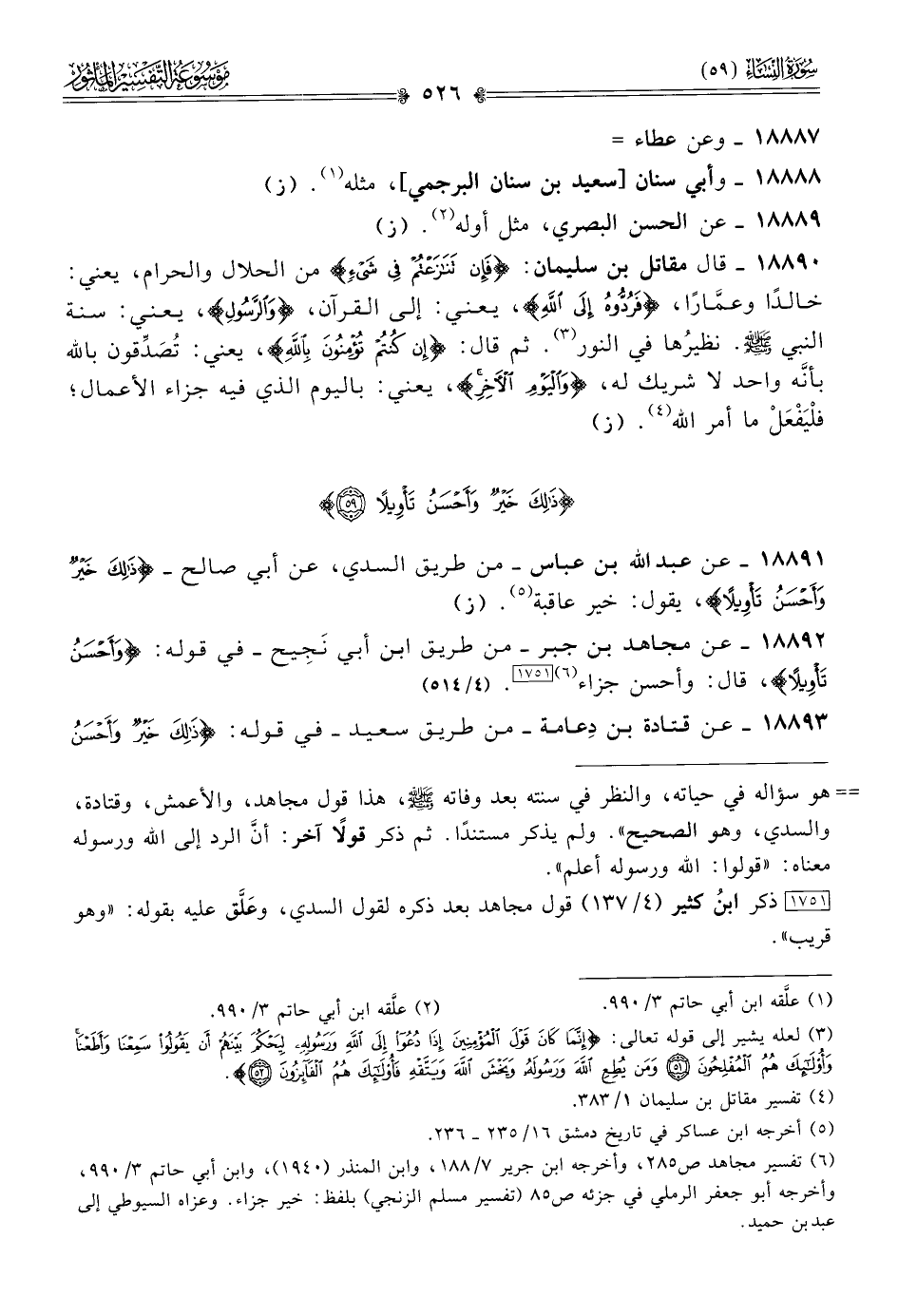 ١٨٨٩١ - عن عبد الله بن عباس -من طريق السدي، عن أبي صالح- {ذلك خير وأحسن تأويلا}، يقول: خير عاقبة (¬٥). (ز)