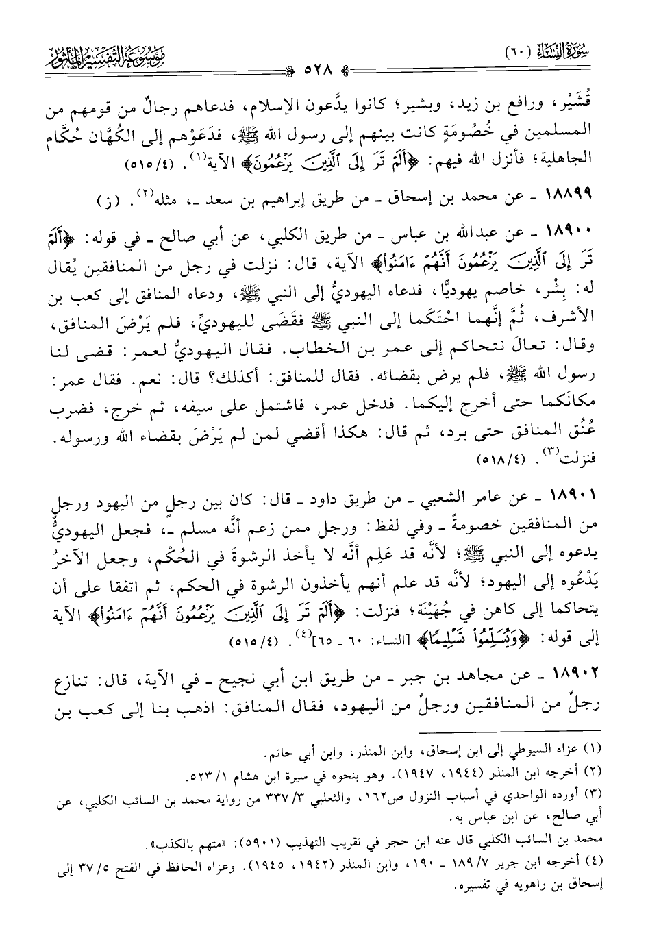 ١٨٩٠١ - عن عامر الشعبي -من طريق داود- قال: كان بين رجلٍ من اليهود ورجلٍ من المنافقين خصومةً -وفي لفظ: ورجل ممن زعم أنّه مسلم-، فجعل اليهوديُّ يدعوه إلى النبي - صلى الله عليه وسلم -؛ لأنّه قد عَلِم أنّه لا يأخذ الرشوةَ في الحُكْم، وجعل الآخرُ يَدْعُوه إلى اليهود؛ لأنّه قد علم أنهم يأخذون الرشوة في الحكم، ثم اتفقا على أن يتحاكما إلى كاهن في جُهَيْنَة؛ فنزلت: {ألم تر إلى الذين يزعمون أنهم آمنوا} الآية إلى قوله: {ويسلموا تسليما} (¬٤). (٤/ ٥١٥)