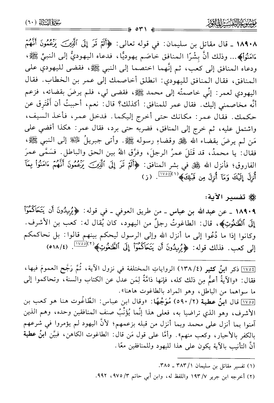 ١٨٩٠٩ - عن عبد الله بن عباس -من طريق العوفي- في قوله: {يريدون أن يتحاكموا إلى الطاغوت}، قال: الطاغوتُ رجلٌ من اليهود، كان يُقال له: كعب بن الأشرف. وكانوا إذا ما دُعُوا إلى ما أنزل الله وإلى الرسول ليحكم بينهم قالوا: بل نحاكمكم إلى كعب. فذلك قوله: {يريدون أن يتحاكموا إلى الطاغوت} (¬٢) [١٧٥٥]. (٤/ ٥١٨)