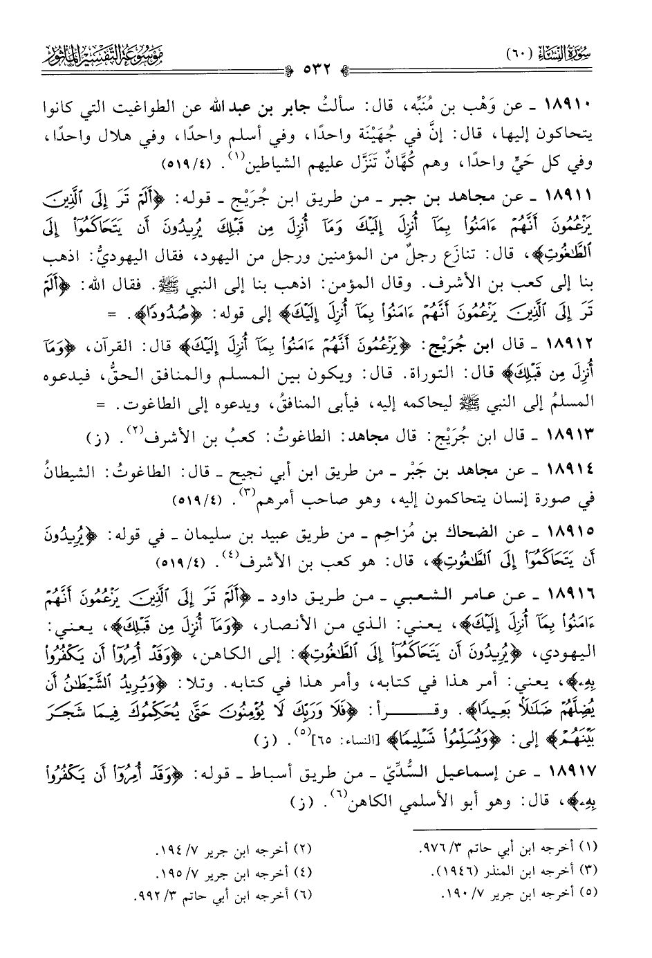 ١٨٩١٥ - عن الضحاك بن مُزاحِم -من طريق عبيد بن سليمان- في قوله: {يريدون أن يتحاكموا إلى الطاغوت}، قال: هو كعب بن الأشرف (¬٤). (٤/ ٥١٩)