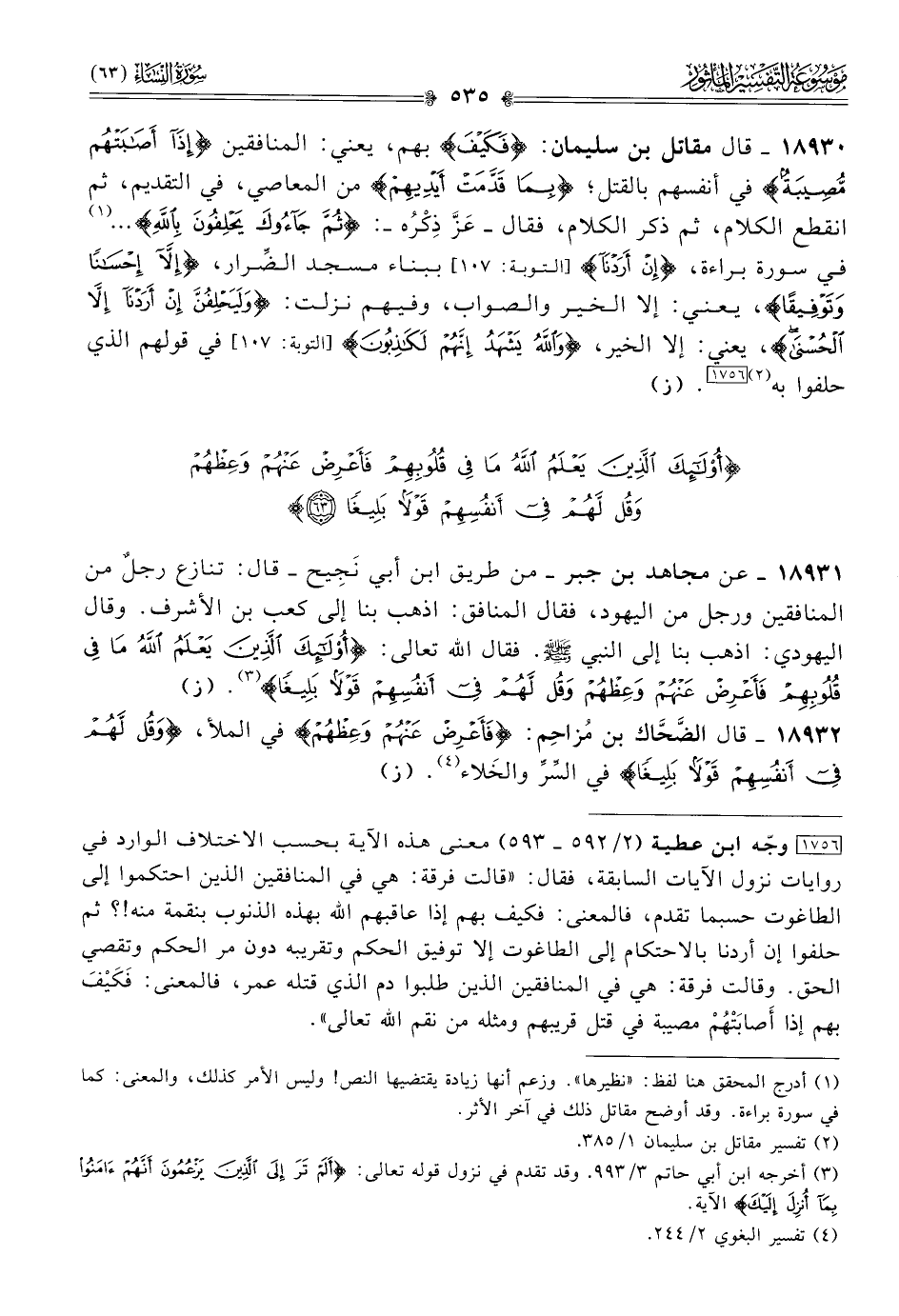 (¬١) أدرج المحقق هنا لفظ: «نظيرها». وزعم أنها زيادة يقتضيها النص! وليس الأمر كذلك، والمعنى: كما في سورة براءة. وقد أوضح مقاتل ذلك في آخر الأثر.