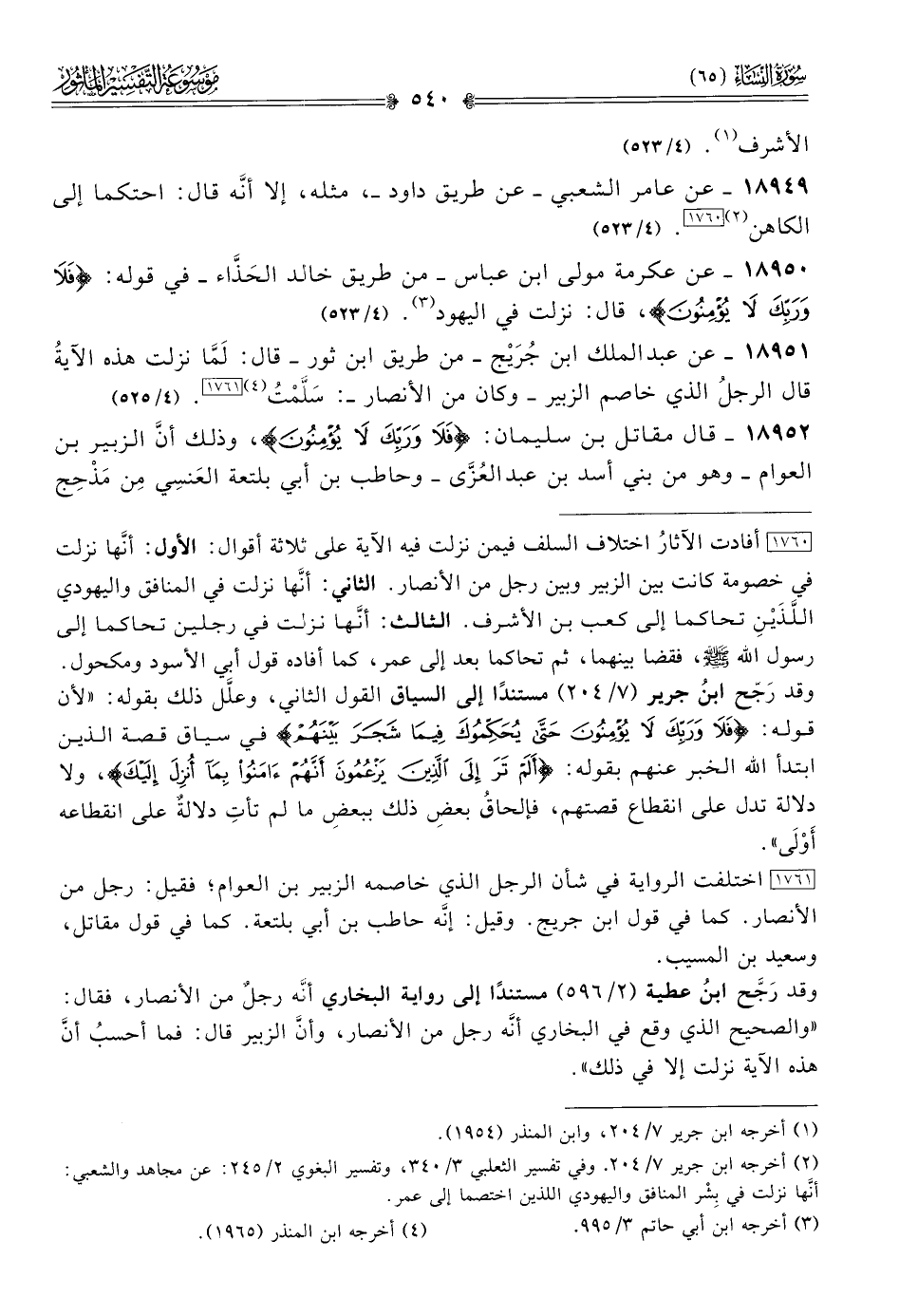 [١٧٦٠] أفادت الآثارُ اختلاف السلف فيمن نزلت فيه الآية على ثلاثة أقوال: الأول: أنّها نزلت في خصومة كانت بين الزبير وبين رجل من الأنصار. الثاني: أنّها نزلت في المنافق واليهودي اللَّذَيْنِ تحاكما إلى كعب بن الأشرف. الثالث: أنّها نزلت في رجلين تحاكما إلى رسول الله - صلى الله عليه وسلم -، فقضا بينهما، ثم تحاكما بعد إلى عمر، كما أفاده قول أبي الأسود ومكحول.