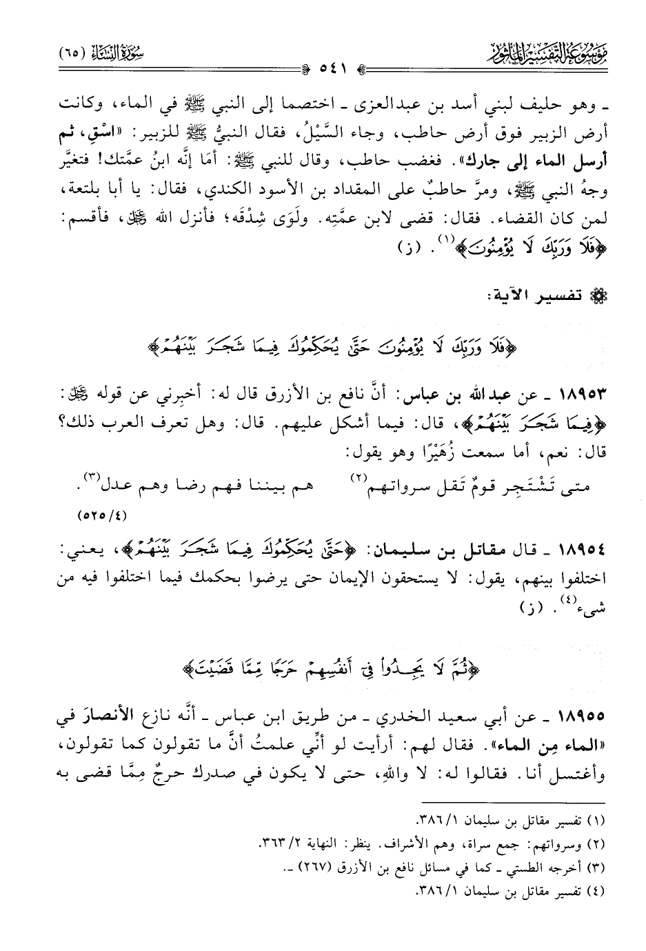 ١٨٩٥٤ - قال مقاتل بن سليمان: {حتى يحكموك فيما شجر بينهم}، يعني: اختلفوا بينهم، يقول: لا يستحقون الإيمان حتى يرضوا بحكمك فيما اختلفوا فيه من شئ (¬٤). (ز)