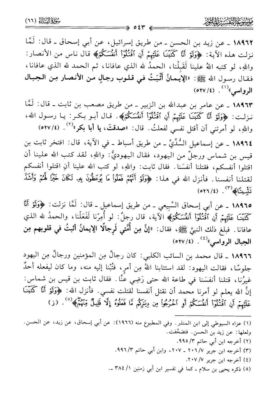 ١٨٩٦٥ - عن أبي إسحاق السَّبِيعي -من طريق إسماعيل- قال: لَمّا نزلت: {ولو أنا كتبنا عليهم أن اقتلوا أنفسكم} الآية، قال رجلٌ: لو أُمِرْنا لَفَعَلْنا، والحمدُ لله الذي عافانا. فبلغ ذلك النبي - صلى الله عليه وسلم -، فقال: «إنّ مِن أُمَّتي لَرِجالًا الإيمانُ أثبتُ في قلوبهم مِن الجبال الرواسي» (¬٤). (٤/ ٥٢٧)