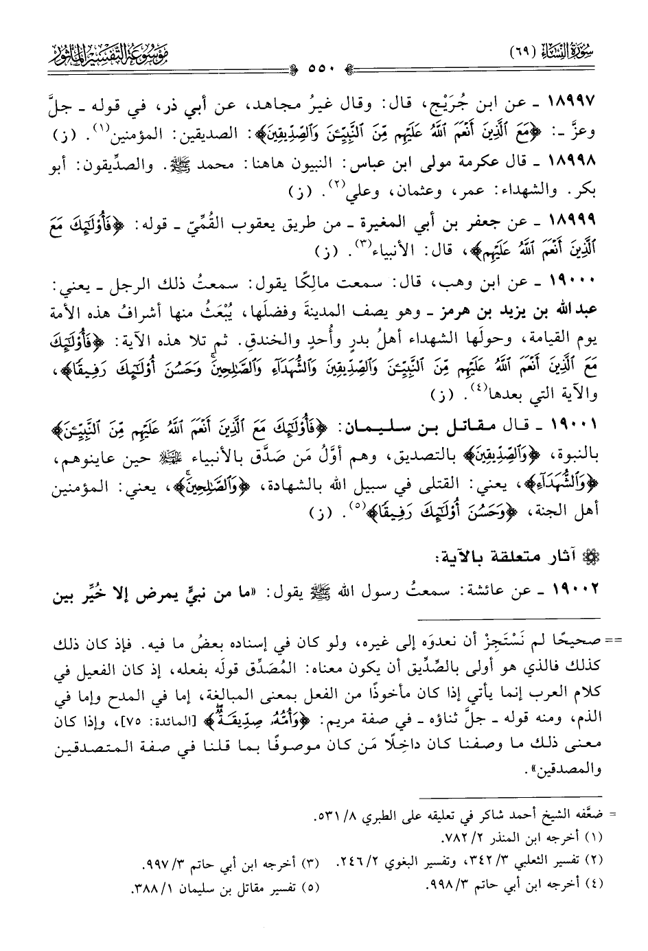 ١٨٩٩٧ - عن ابن جُرَيْج، قال: وقال غيرُ مجاهد، عن أبي ذر، في قوله -جلَّ وعزَّ-: {مع الذين أنعم الله عليهم من النبيين والصديقين}: الصديقين: المؤمنين (¬١). (ز)