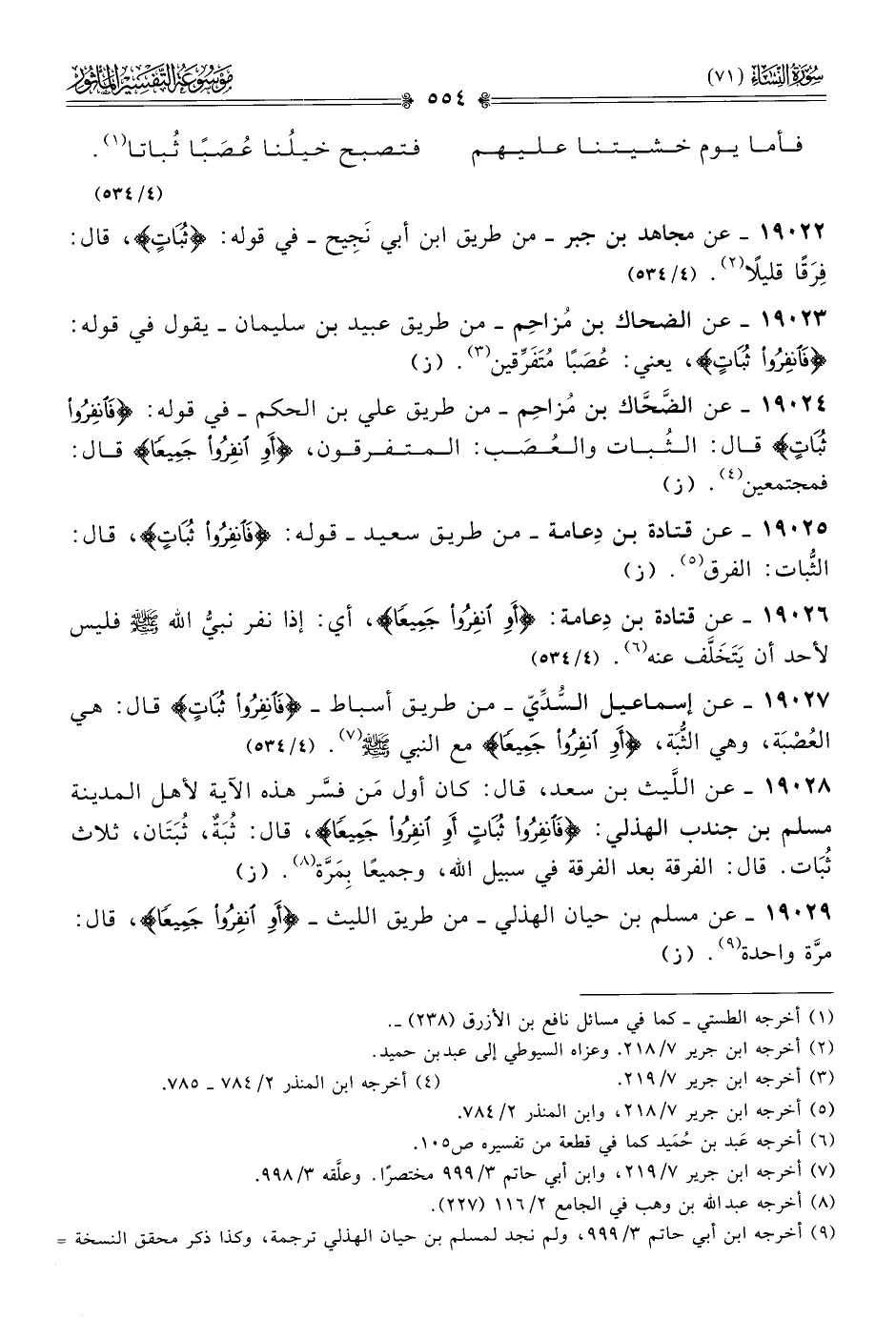 ١٩٠٢٨ - عن اللَّيث بن سعد، قال: كان أول مَن فسَّر هذه الآية لأهل المدينة مسلم بن جندب الهذلي: {فانفروا ثبات أو انفروا جميعا}، قال: ثُبَةٌ، ثُبَتان، ثلاث ثُبات. قال: الفرقة بعد الفرقة في سبيل الله، وجميعًا بِمَرَّة (¬٨). (ز)