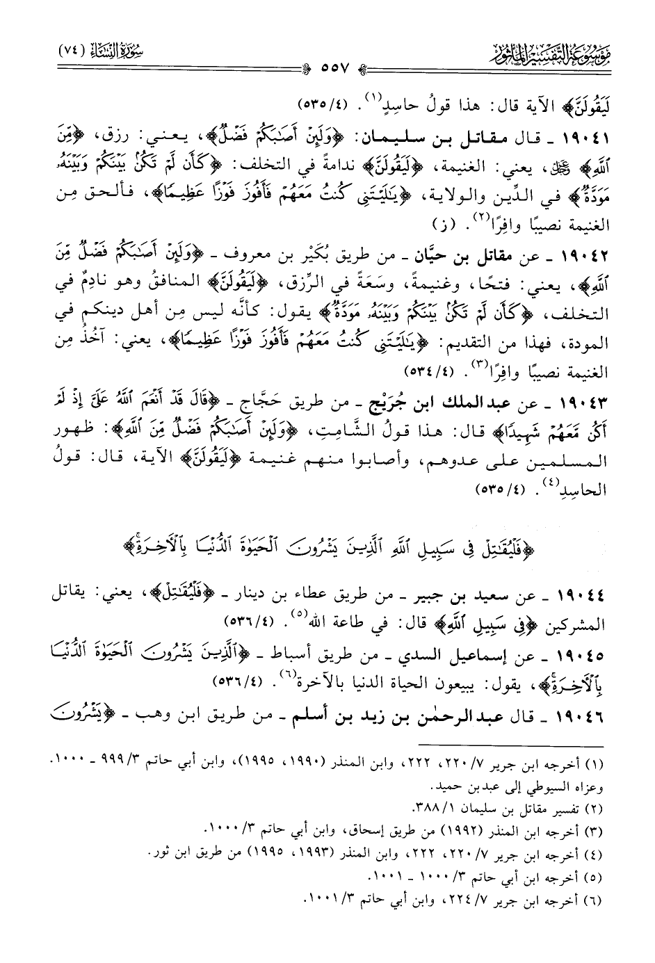 ١٩٠٤٤ - عن سعيد بن جبير -من طريق عطاء بن دينار- {فليقاتل} يعني: يقاتل المشركين {في سبيل الله} قال: في طاعة الله (¬٥). (٤/ ٥٣٦)