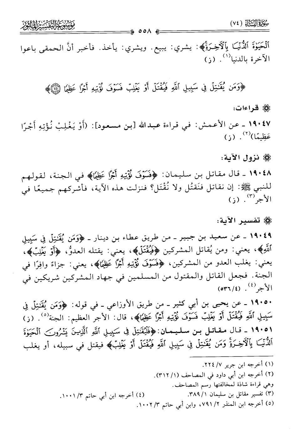 ١٩٠٤٩ - عن سعيد بن جبير -من طريق عطاء بن دينار- {ومن يقاتل في سبيل الله} يعني: ومن يُقاتل المشركين {فيُقتل} يعني: يقتله العدوُّ، {أو يغلب} يعني: يغلب العدو من المشركين، {فسوف نؤتيه أجرا عظيما}، يعني: جزاءً وافِرًا في الجنة. فجعل القاتل والمقتول من المسلمين في جهاد المشركين شريكين في الأجر (¬٤). (٤/ ٥٣٦)