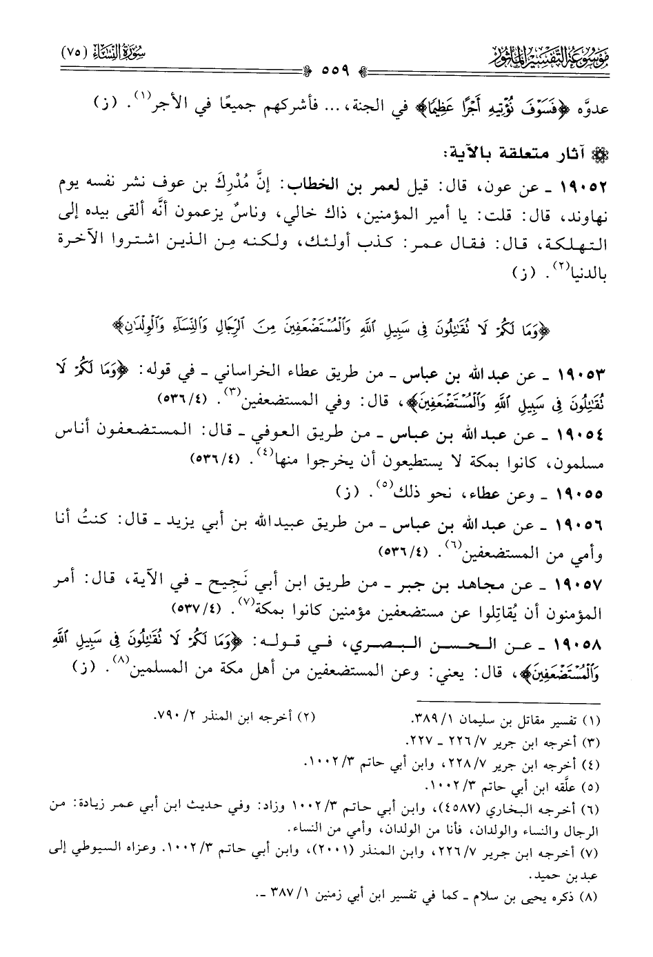 ١٩٠٥٣ - عن عبد الله بن عباس -من طريق عطاء الخراساني- في قوله: {وما لكم لا تقاتلون في سبيل الله والمستضعفين}، قال: وفي المستضعفين (¬٣). (٤/ ٥٣٦)