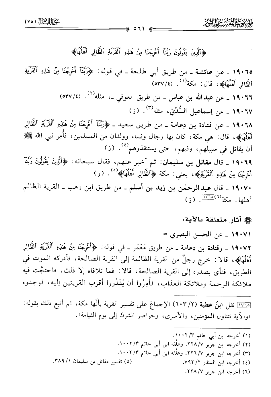 ١٩٠٦٨ - عن قتادة بن دِعامة -من طريق سعيد- {ربنا أخرجنا من هذه القرية الظالم أهلها}، قال: هي مكة، كان بها رجال ونساء وولدان من المسلمين، فأُمِر نبي الله - صلى الله عليه وسلم - أن يقاتل في سبيلهم، وفيهم، حتى يستنقذوهم (¬٤). (ز)