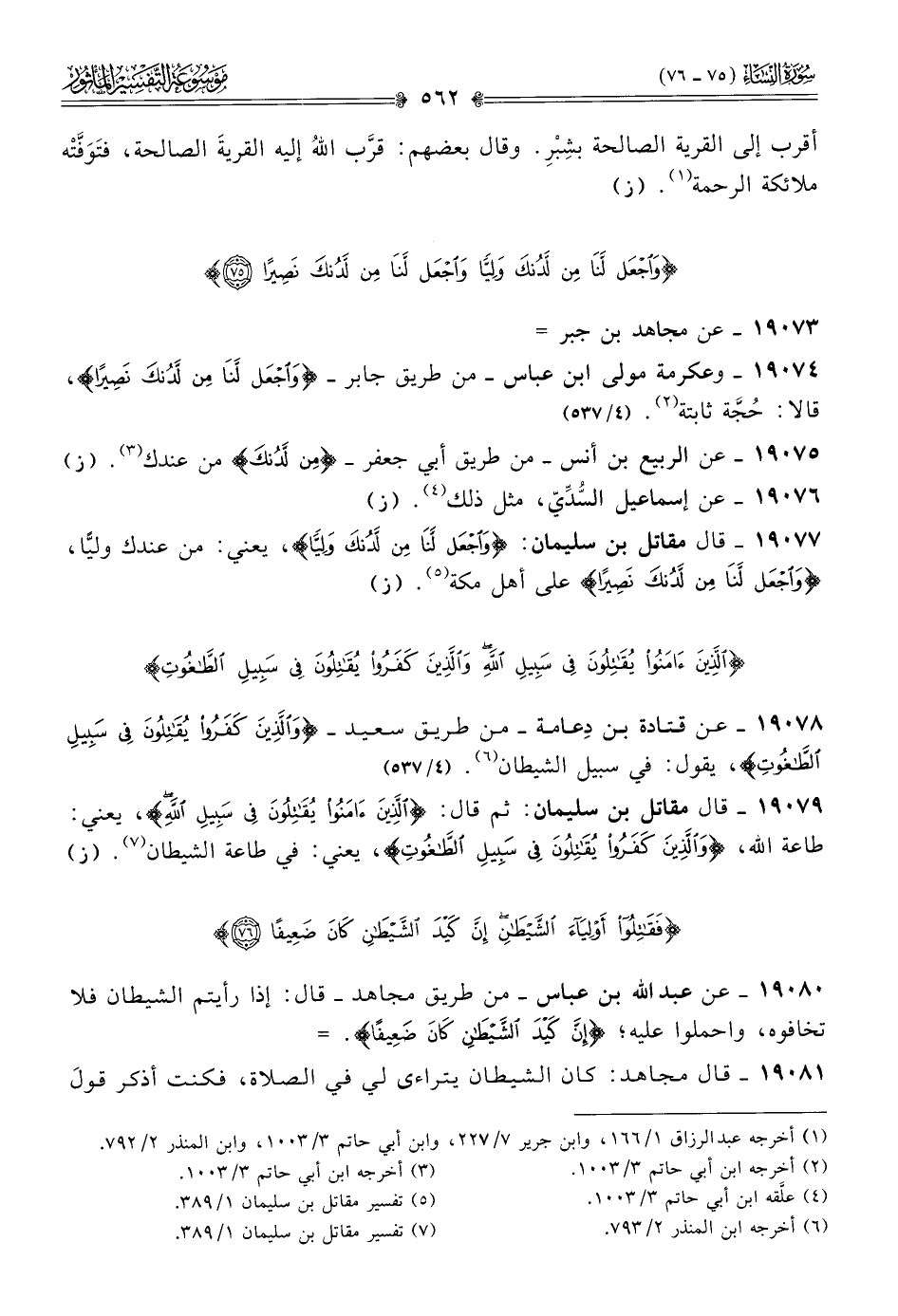 ١٩٠٧٤ - وعكرمة مولى ابن عباس -من طريق جابر- {واجعل لنا من لدنك نصيرا}، قالا: حُجَّة ثابتة (¬٢). (٤/ ٥٣٧)