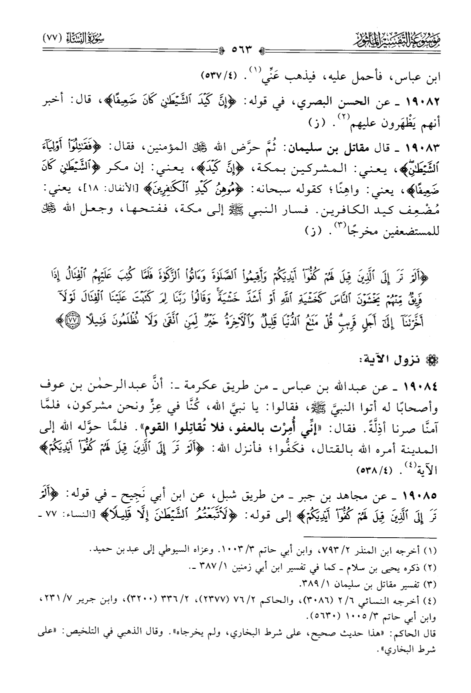 ١٩٠٨٥ - عن مجاهد بن جبر -من طريق شبل، عن ابن أبي نَجِيح- في قوله: {ألم تر إلى الذين قيل لهم كفوا أيديكم} إلى قوله: {لاتبعتم الشيطان إلا قليلا} [النساء: ٧٧ -