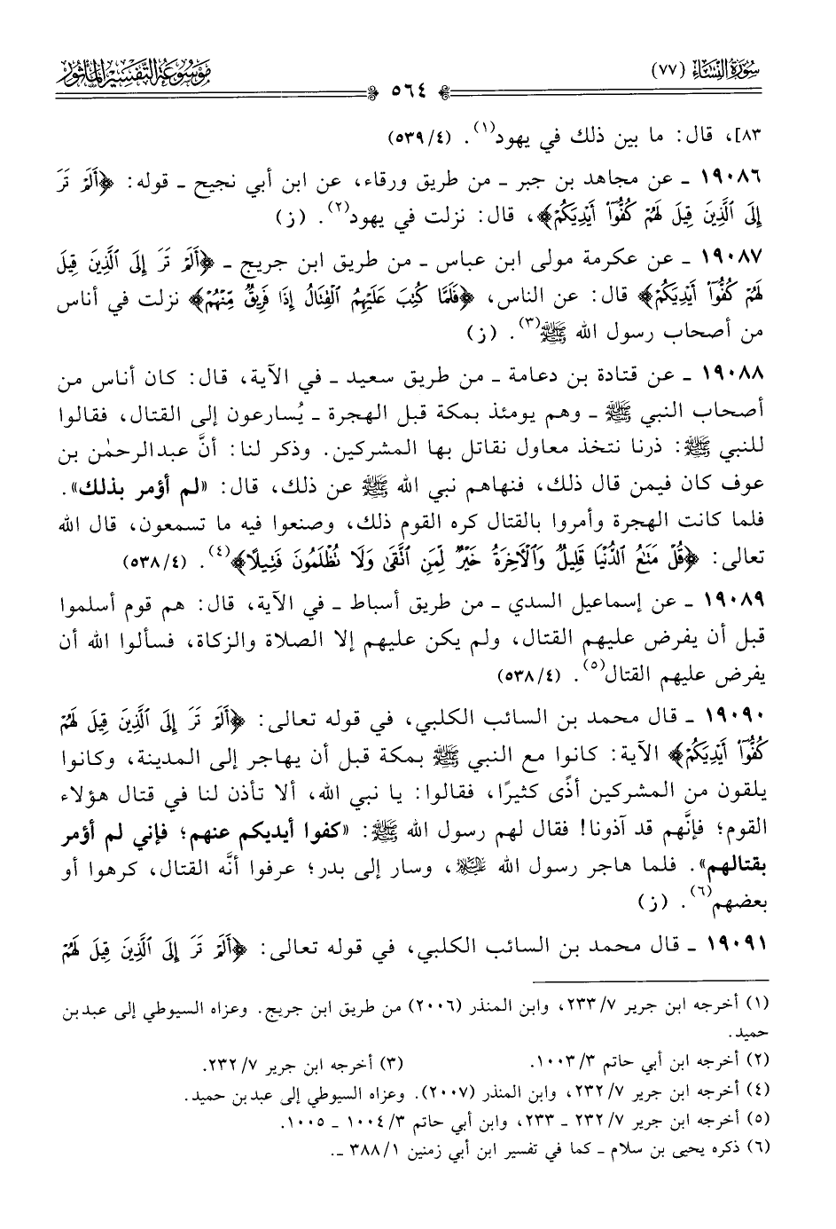 ١٩٠٨٧ - عن عكرمة مولى ابن عباس -من طريق ابن جريج- {ألم تر إلى الذين قيل لهم كفوا أيديكم} قال: عن الناس، {فلما كتب عليهم القتال إذا فريق منهم} نزلت في أناس من أصحاب رسول الله - صلى الله عليه وسلم - (¬٣). (ز)