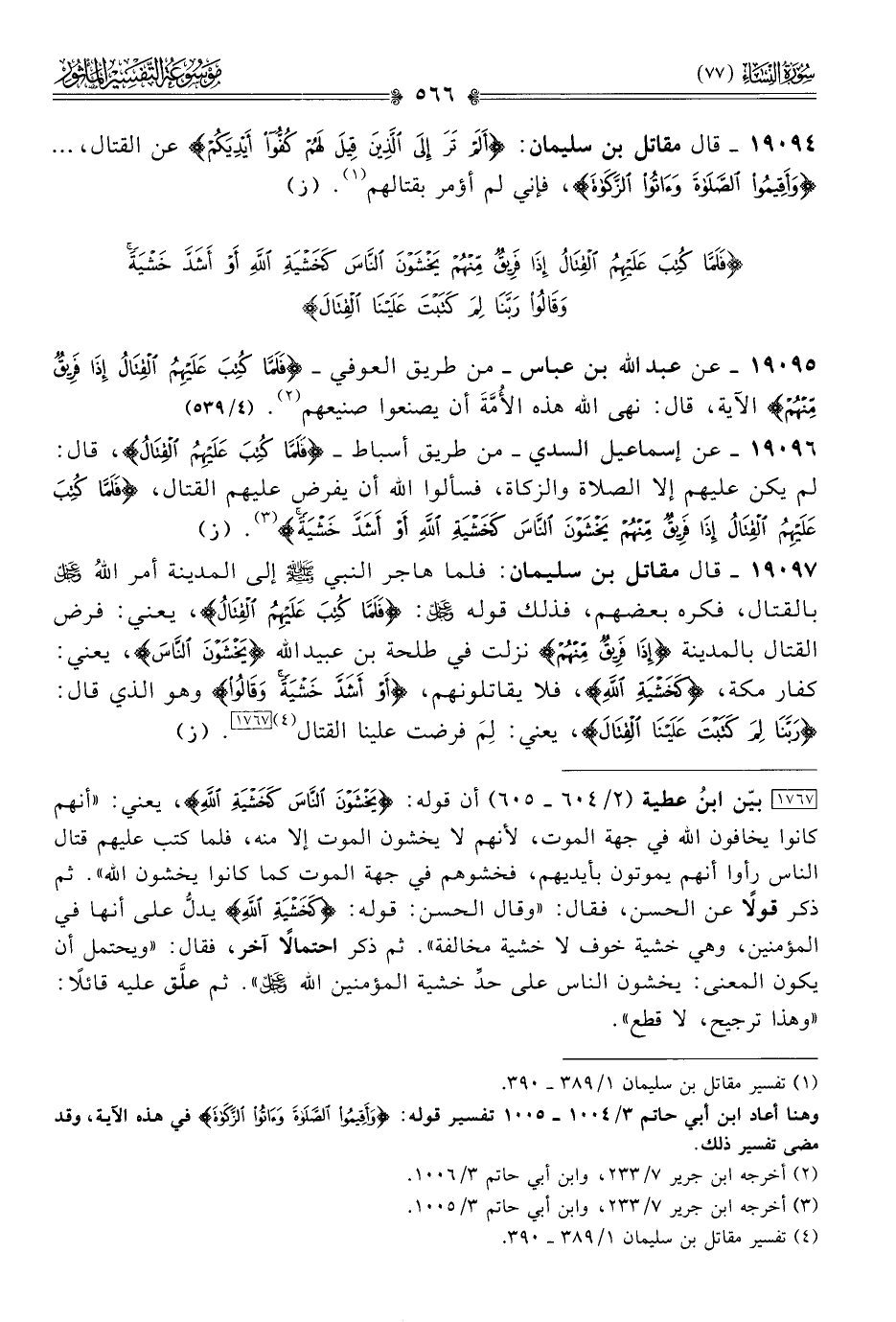 ١٩٠٩٧ - قال مقاتل بن سليمان: فلما هاجر النبي - صلى الله عليه وسلم - إلى المدينة أمر اللهُ - عز وجل - بالقتال، فكره بعضهم، فذلك قوله - عز وجل -: {فلما كتب عليهم القتال} يعني: فرض القتال بالمدينة {إذا فريق منهم} نزلت في طلحة بن عبيد الله {يخشون الناس} يعني: كفار مكة، {كخشية الله}، فلا يقاتلونهم، {أو أشد خشية وقالوا} وهو الذي قال: {ربنا لم كتبت علينا القتال}. يعني: لِمَ فرضت علينا القتال (¬٤) [١٧٦٧]. (ز)