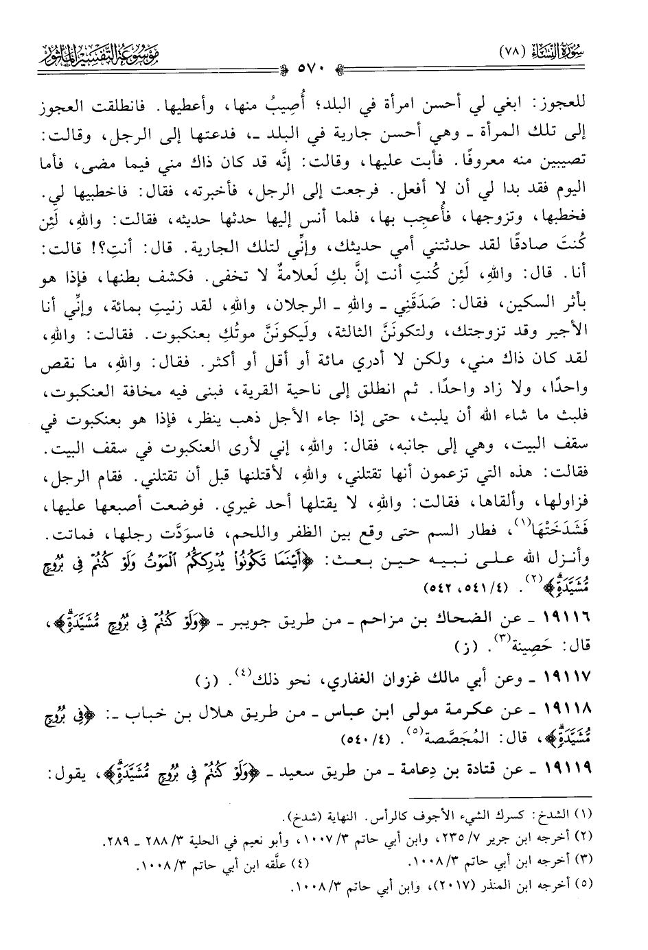 للعجوز: ابغي لي أحسن امرأة في البلد؛ أُصِيبُ منها، وأعطيها. فانطلقت العجوز إلى تلك المرأة -وهي أحسن جارية في البلد-، فدعتها إلى الرجل، وقالت: تصيبين منه معروفًا. فأبت عليها، وقالت: إنّه قد كان ذاك مني فيما مضى، فأما اليوم فقد بدا لي أن لا أفعل. فرجعت إلى الرجل، فأخبرته، فقال: فاخطبيها لي. فخطبها، وتزوجها، فأُعجِب بها، فلما أنس إليها حدثها حديثه، فقالت: واللهِ، لَئِن كُنتَ صادقًا لقد حدثتني أمي حديثك، وإنِّي لتلك الجارية. قال: أنتِ؟! قالت: أنا. قال: واللهِ، لَئِن كُنتِ أنت إنّ بكِ لَعلامةٌ لا تخفى. فكشف بطنها، فإذا هو بأثر السكين، فقال: صَدَقَنِي -واللهِ- الرجلان، واللهِ، لقد زنيتِ بمائة، وإنِّي أنا الأجير وقد تزوجتك، ولتكونَنَّ الثالثة، ولَيكونَنَّ موتُكِ بعنكبوت. فقالت: واللهِ، لقد كان ذاك مني، ولكن لا أدري مائة أو أقل أو أكثر. فقال: واللهِ، ما نقص واحدًا، ولا زاد واحدًا. ثم انطلق إلى ناحية القرية، فبنى فيه مخافة العنكبوت، فلبث ما شاء الله أن يلبث، حتى إذا جاء الأجل ذهب ينظر، فإذا هو بعنكبوت في سقف البيت، وهي إلى جانبه، فقال: واللهِ، إني لأرى العنكبوت في سقف البيت. فقالت: هذه التي تزعمون أنها تقتلني، واللهِ، لأقتلنها قبل أن تقتلني. فقام الرجل، فزاولها، وألقاها، فقالت: واللهِ، لا يقتلها أحد غيري. فوضعت أصبعها عليها، فَشَدَخَتْها (¬١)، فطار السم حتى وقع بين الظفر واللحم، فاسوَدَّت رجلها، فماتت. وأنزل الله على نبيه حين بعث: {أينما تكونوا يدرككم الموت ولو كنتم في بروج مشيدة} (¬٢). (٤/ ٥٤١ - ٥٤٢)