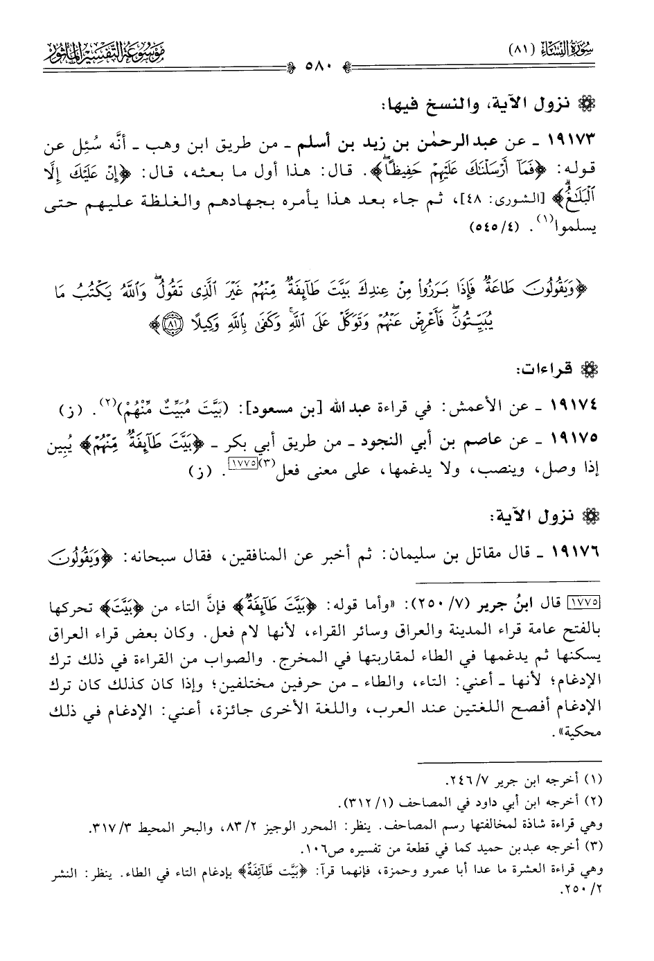 ١٩١٧٤ - عن الأعمش: في قراءة عبد الله [بن مسعود]: (بَيَّتَ مُبَيِّتٌ مِّنْهُمْ) (¬٢). (ز)