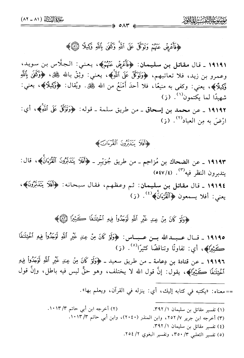 ١٩١٩٣ - عن الضحاك بن مُزاحِم -من طريق جُوَيْبِر- {أفلا يتدبرون القرآن}، قال: يتدبرون النظر فيه (¬٣). (٤/ ٥٤٧)