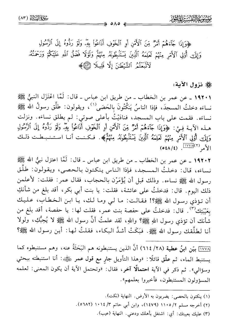 ١٩٢٠١ - عن عمر بن الخطاب -من طريق ابن عباس- قال: لَمّا اعْتَزَل النبي - صلى الله عليه وسلم - نساءَه دخلتُ المسجدَ، فإذا الناسُ يَنكُتُونَ بِالحَصى (¬١)، ويقولون: طلَّق رسول الله - صلى الله عليه وسلم - نساءَه. فقمت على باب المسجد، فنادَيْتُ بأعلى صوتي: لم يطلق نساءَه. ونزلت هذه الآية فِيَّ: {وإذا جاءهم أمر من الأمن أو الخوف أذاعوا به ولو ردوه إلى الرسول وإلى أولي الأمر منهم لعلمه الذين يستنبطونه منهم}. فكنت أنا استنبطت ذلك الأمر (¬٢) [١٧٧٨].