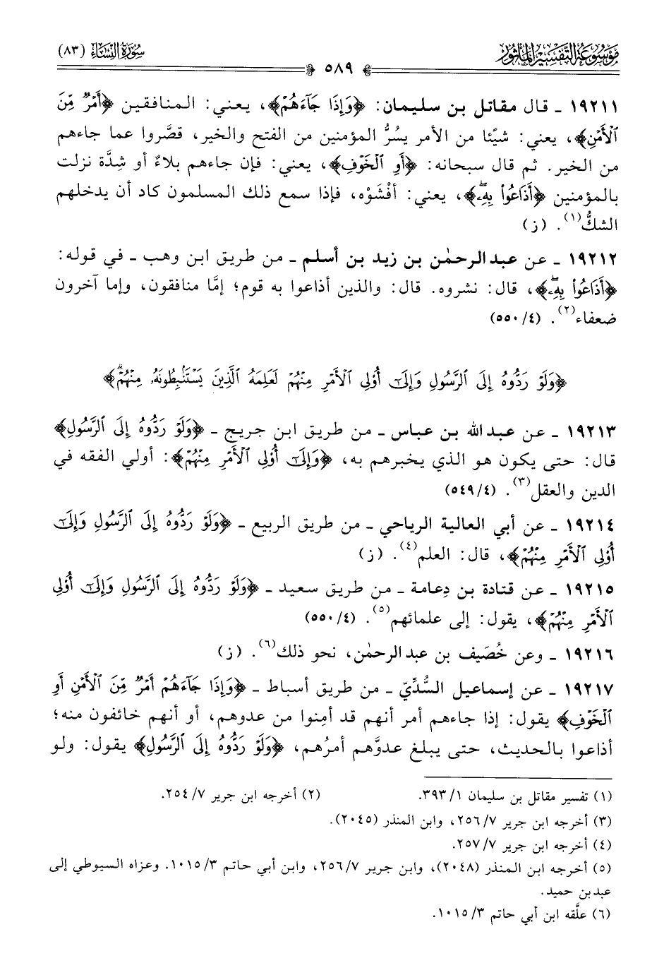 ١٩٢١٥ - عن قتادة بن دِعامة -من طريق سعيد- {ولو ردوه إلى الرسول وإلى أولي الأمر منهم}، يقول: إلى علمائهم (¬٥).
