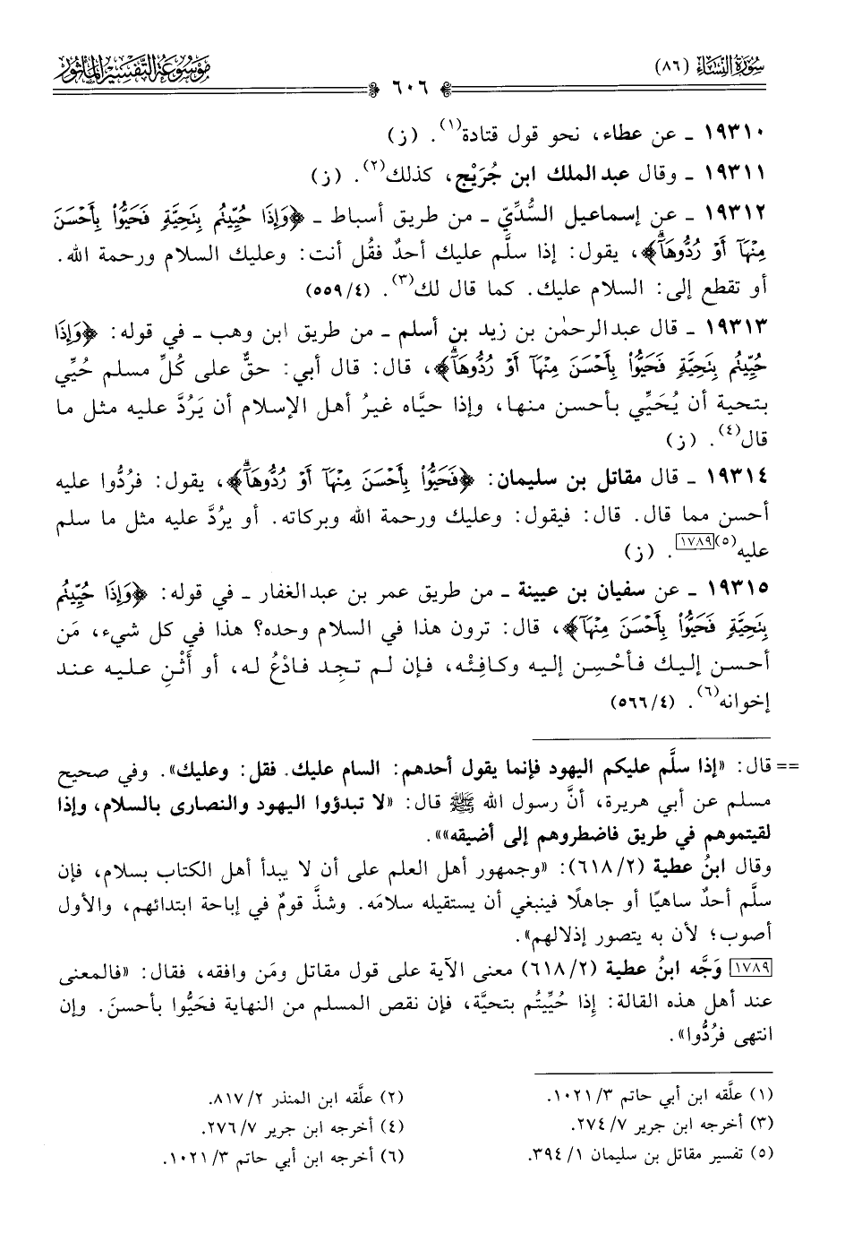 ١٩٣١٤ - قال مقاتل بن سليمان: {فحيوا بأحسن منها أو ردوها}، يقول: فرُدُّوا عليه أحسن مما قال. قال: فيقول: وعليك ورحمة الله وبركاته. أو يرُدَّ عليه مثل ما سلم عليه (¬٥) [١٧٨٩]. (ز)