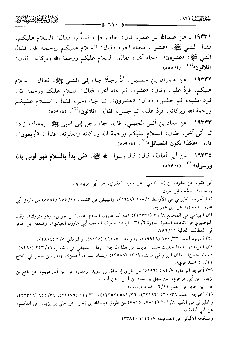 ١٩٣٣٤ - عن أبي أمامة، قال: قال رسول الله - صلى الله عليه وسلم -: «مَن بدأ بالسلام فهو أولى بالله ورسوله» (¬٤). (٤/ ٥٦٣)