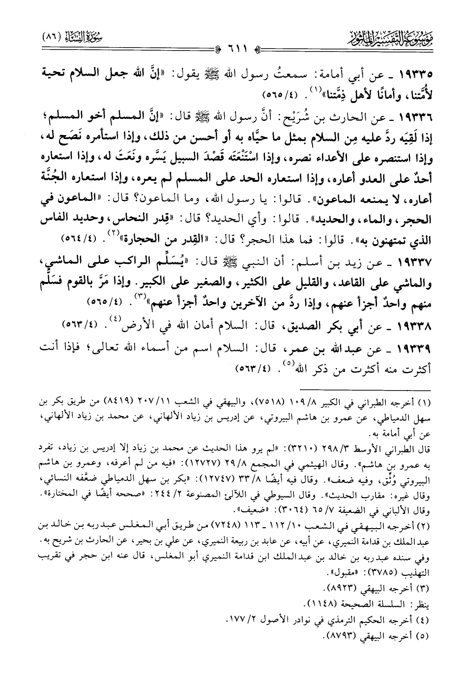 ١٩٣٣٥ - عن أبي أمامة: سمعتُ رسول الله - صلى الله عليه وسلم - يقول: «إنّ الله جعل السلام تحية لأُمَّتنا، وأمانًا لأهل ذِمَّتنا» (¬١). (٤/ ٥٦٥)