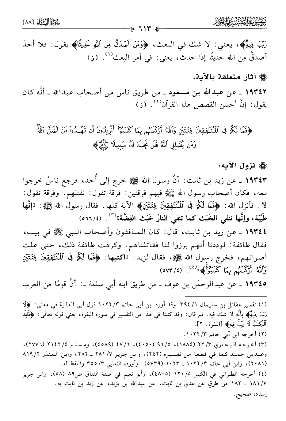 ١٩٣٤٤ - عن زيد بن ثابت، قال: كان المنافقون وأصحاب النبي - صلى الله عليه وسلم - في بيت، فقال طائفة: لوددنا أنهم برزوا لنا فقاتلناهم. وكرهت طائفة ذلك، حتى علت أصواتهم، فخرج رسول الله - صلى الله عليه وسلم -، فقال لزيد: «اكتبها: {فما لكم في المنافقين فئتين والله أركسهم بما كسبوا}» (¬٤). (٤/ ٥٧٣)