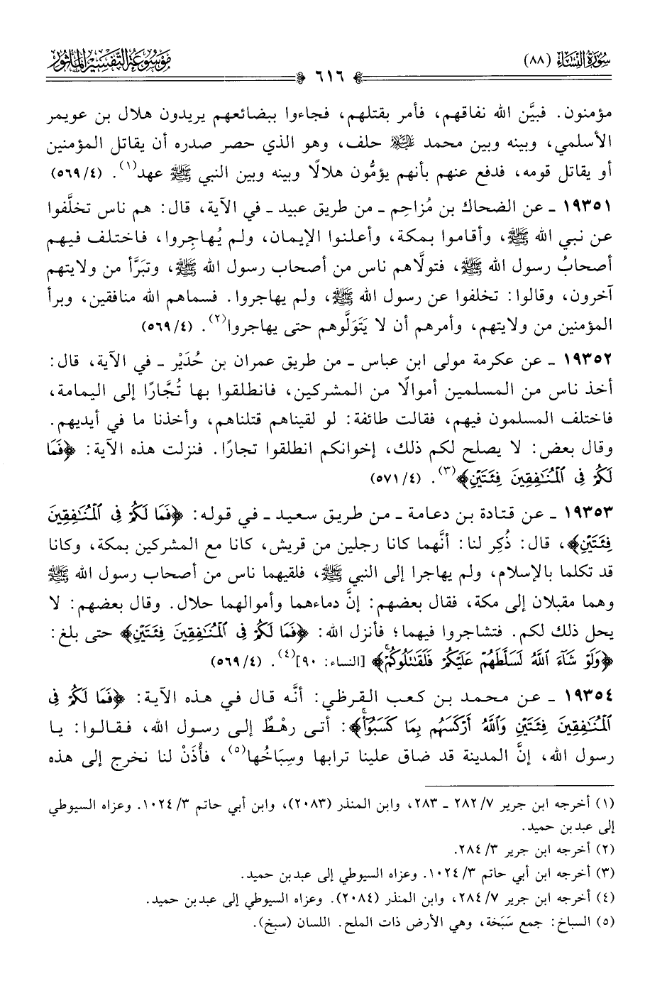 ١٩٣٥٢ - عن عكرمة مولى ابن عباس -من طريق عمران بن حُدَيْر- في الآية، قال: أخذ ناس من المسلمين أموالًا من المشركين، فانطلقوا بها تُجّارًا إلى اليمامة، فاختلف المسلمون فيهم، فقالت طائفة: لو لقيناهم قتلناهم، وأخذنا ما في أيديهم. وقال بعض: لا يصلح لكم ذلك، إخوانكم انطلقوا تجارًا. فنزلت هذه الآية: {فما لكم في المنافقين فئتين} (¬٣). (٤/ ٥٧١)