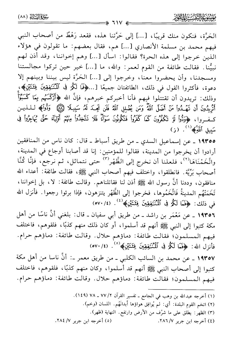 ١٩٣٥٥ - عن إسماعيل السدي -من طريق أسباط- قال: كان ناس من المنافقين أرادوا أن يخرجوا من المدينة، فقالوا للمؤمنين: إنا قد أصابنا أوجاع في المدينة، واتَّخَمْناها (¬٢)، فلعلنا أن نخرج إلى الظَّهْر (¬٣) حتى نتماثل، ثم نرجع، فإنّا كُنّا أصحاب بَرِّيَّة. فانطلقوا، واختلف فيهم أصحاب النبي - صلى الله عليه وسلم -، فقالت طائفة: أعداء الله منافقون، وددنا أنّ رسول الله - صلى الله عليه وسلم - أذن لنا فقاتلناهم. وقالت طائفة: لا، بل إخواننا، تَخَمَتْهُم المدينةُ فاتَّخَمُوها، فخرجوا إلى الظَّهْر يتنزهون، فإذا برئوا رجعوا. فأنزل الله في ذلك: {فما لكم في المنافقين فئتين} (¬٤). (٤/ ٥٧٠)