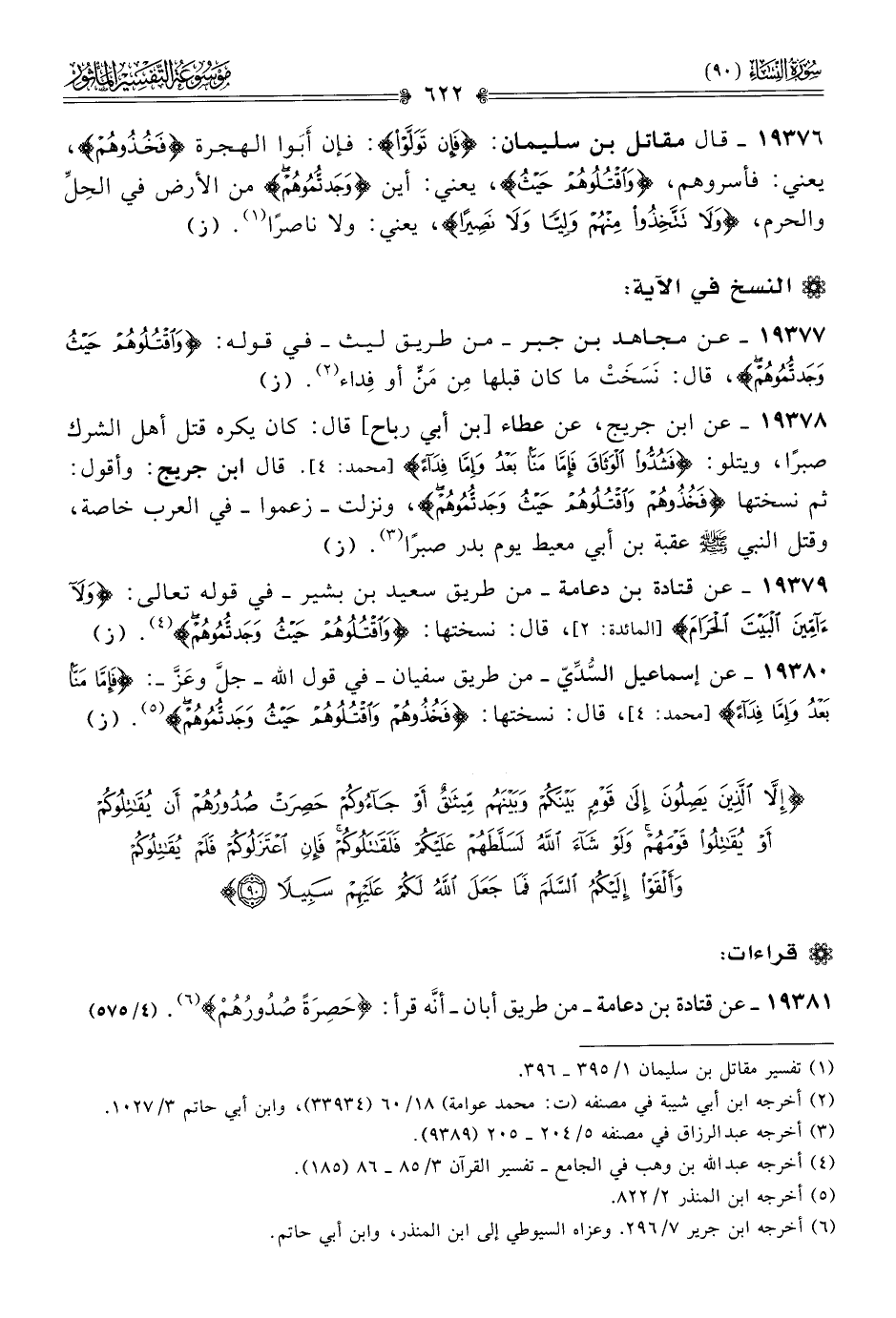 ١٩٣٨٠ - عن إسماعيل السُّدِّيّ -من طريق سفيان- في قول الله -جلَّ وعَزَّ-: {فإما منا بعد وإما فداء} [محمد: ٤]، قال: نسختها: {فخذوهم واقتلوهم حيث وجدتموهم} (¬٥). (ز)