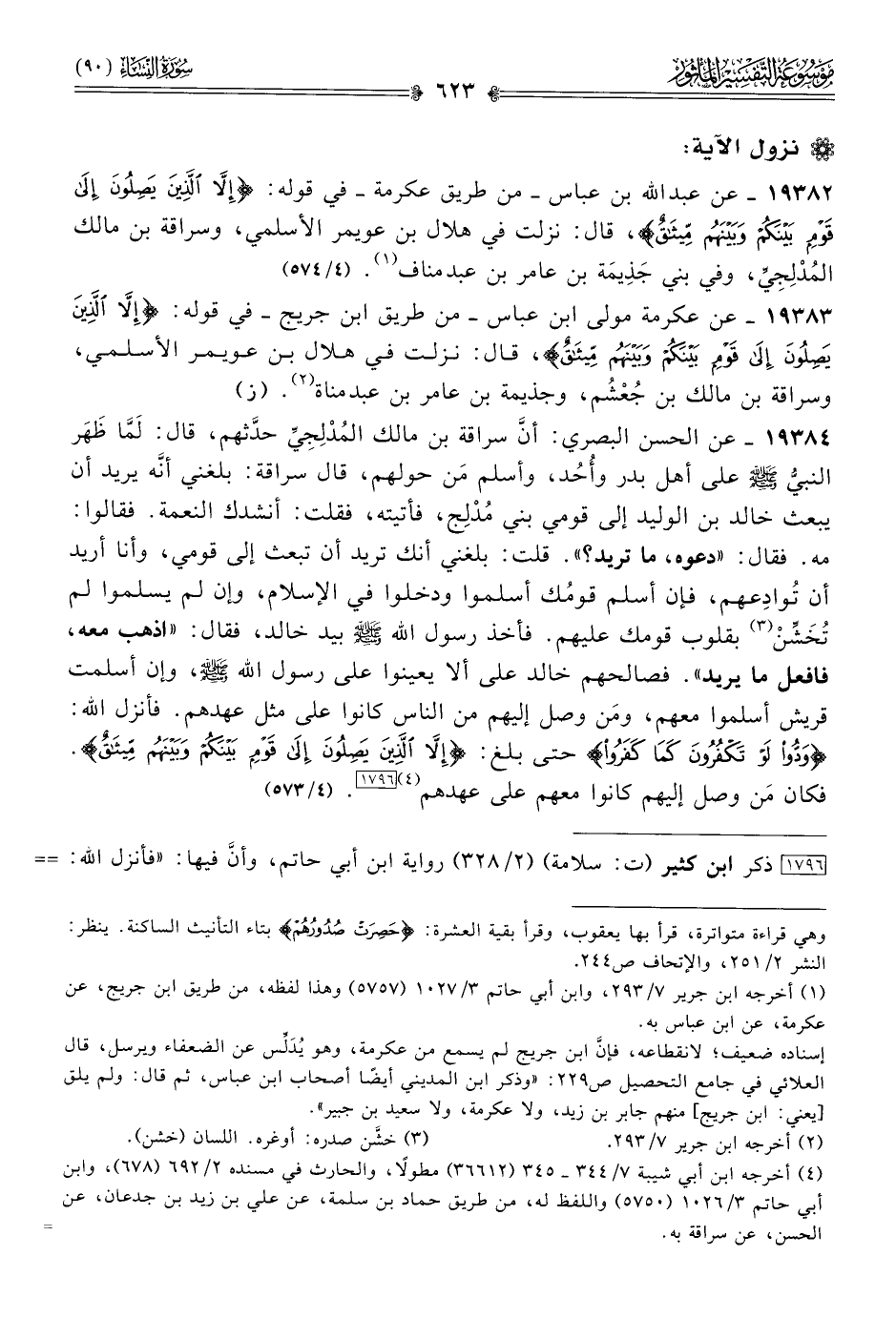 ١٩٣٨٤ - عن الحسن البصري، أنّ سراقة بن مالك المُدْلِجِيِّ حدَّثهم، قال: لَمّا ظَهَر النبي - صلى الله عليه وسلم - على أهل بدر وأُحُد، وأسلم مَن حولهم، قال سراقة: بلغني أنّه يريد أن يبعث خالد بن الوليد إلى قومي بني مُدْلِج، فأتيته، فقلت: أنشدك النعمة. فقالوا: مه. فقال: «دعوه، ما تريد؟». قلت: بلغني أنك تريد أن تبعث إلى قومي، وأنا أريد أن تُوادِعهم، فإن أسلم قومُك أسلموا ودخلوا في الإسلام، وإن لم يسلموا لم تُخَشِّنْ (¬٣) بقلوب قومك عليهم. فأخذ رسول الله - صلى الله عليه وسلم - بيد خالد، فقال: «اذهب معه، فافعل ما يريد». فصالحهم خالد على ألا يعينوا على رسول الله - صلى الله عليه وسلم -، وإن أسلمت قريش أسلموا معهم، ومَن وصل إليهم من الناس كانوا على مثل عهدهم. فأنزل الله: {ودوا لو تكفرون كما كفروا} حتى بلغ: {إلا الذين يصلون إلى قوم بينكم وبينهم ميثاق}. فكان مَن وصل إليهم كانوا معهم على عهدهم (¬٤) [١٧٩٦]. (٤/ ٥٧٣)