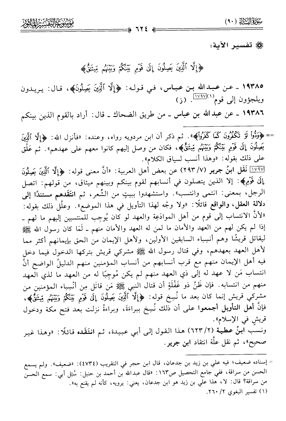 [١٧٩٧] نَقَل ابنُ جرير (٧/ ٢٩٣) عن بعض أهل العربية: «أنّ معنى قوله: {إلّا الَّذِينَ يَصِلُونَ إلى قَوْمٍ}: إلا الذين يتصلون في أنسابهم لقوم بينكم وبينهم ميثاق، من قولهم: اتصل الرجل، بمعنى: انتمى وانتسب». واستشهدوا ببيتٍ من الشِّعر، ثم انتَقَدهم مستندًا إلى دلالة العقل، والواقع قائلًا: «ولا وجْه لهذا التأويل في هذا الموضع». وعلَّل ذلك بقوله: «لأنّ الانتساب إلى قوم من أهل الموادَعِة والعهد لو كان يُوجِب للمنتسبين إليهم ما لهم -إذا لم يكن لهم من العهد والأمان ما لمن له العهد والأمان منهم- لَما كان رسول الله - صلى الله عليه وسلم - ليقاتل قريشًا وهم أنسِباء السابقين الأولين، ولأهل الإيمان من الحق بإيمانهم أكثر مما لأهل العهد بعهدهم، وفي قتال رسول الله - صلى الله عليه وسلم - مشركي قريش بتركها الدخول فيما دخل فيه أهل الإيمان منهم مع قرب أنسابهم من أنساب المؤمنين منهم الدليلُ الواضح أنّ انتساب مَن لا عهد له إلى ذي العهد منهم لم يكن مُوجِبًا له من العهد ما لذي العهد منهم من انتسابه. فإن ظَنَّ ذو غَفْلَةٍ أن قتال النبي - صلى الله عليه وسلم - مَن قاتَل مِن أنْسِباء المؤمنين من مشركي قريش إنما كان بعد ما نُسِخ قوله: {إلّا الَّذِينَ يَصِلُونَ إلى قَوْمٍ بَيْنَكُمْ وبَيْنَهُمْ مِيثاقٌ}، فإنّ أهل التأويل أجمعوا على أن ذلك نُسِخ ببراءَةَ، وبراءةُ نزلت بعد فتح مكة ودخول قريشٍ في الإسلام».