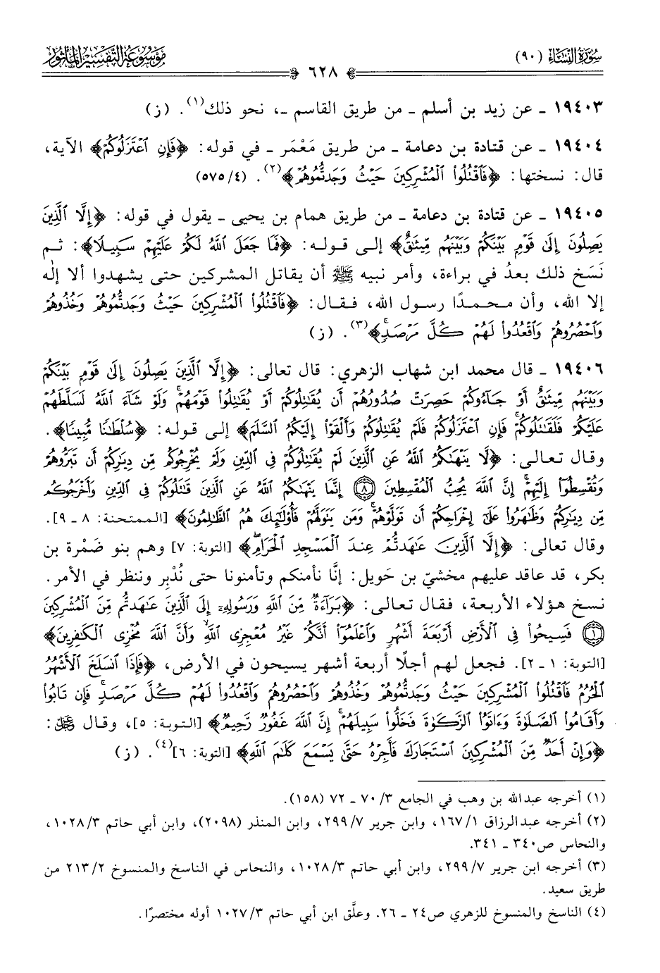 ١٩٤٠٦ - قال محمد ابن شهاب الزهري: قال تعالى: {إلا الذين يصلون إلى قوم بينكم وبينهم ميثاق أو جاؤكم حصرت صدورهم أن يقاتلوكم أو يقاتلوا قومهم ولو شاء الله لسلطهم عليكم فلقاتلوكم فإن اعتزلوكم فلم يقاتلوكم وألقوا إليكم السلم} إلى قوله: {سلطانا مبينا}. وقال تعالى: {لا ينهاكم الله عن الذين لم يقاتلوكم في الدين ولم يخرجوكم من دياركم أن تبروهم وتقسطوا إليهم إن الله يحب المقسطين. إنما ينهاكم الله عن الذين قاتلوكم في الدين وأخرجوكم من دياركم وظاهروا على إخراجكم أن تولوهم ومن يتولهم فأولئك هم الظالمون} [الممتحنة: ٨ - ٩]. وقال تعالى: {إلا الذين عاهدتم عند المسجد الحرام} [التوبة: ٧] وهم بنو ضَمْرة بن بكر، قد عاقد عليهم مخشيّ بن حَويل: إنّا نأمنكم وتأمنونا حتى نُدْبِر وننظر في الأمر. نسخ هؤلاء الأربعة، فقال تعالى: {براءة من الله ورسوله إلى الذين عاهدتم من المشركين. فسيحوا في الأرض أربعة أشهر واعلموا أنكم غير معجزي الله وأن الله مخزي الكافرين} [التوبة: ١ - ٢]. فجعل لهم أجلًا أربعة أشهر يسيحون في الأرض، {فإذا انسلخ الأشهر الحرم فاقتلوا المشركين حيث وجدتموهم وخذوهم واقعدوا لهم كل مرصد فإن تابوا وأقاموا الصلاة وآتوا الزكاة فخلوا سبيلهم إن الله غفور رحيم} [التوبة: ٥]، وقال - عز وجل -: {وإن أحد من المشركين استجارك فأجره حتى يسمع كلام الله} [التوبة: ٦] (¬٤). (ز)