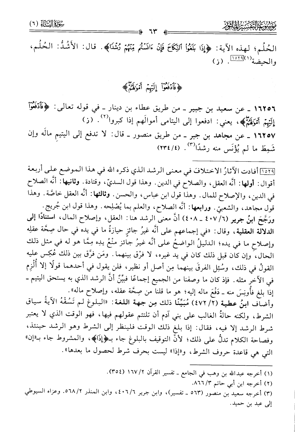 [١٥٢٩] أفادت الآثارُ الاختلافَ في معنى الرشد الذي ذكره الله في هذا الموضع على أربعة أقوال: أولها: أنّه العقل، والصلاح في الدين. وهذا قول السديّ، وقتادة. وثانيها: أنّه الصلاح في الدين، والإصلاح للمال. وهذا قول ابن عباس، والحسن. وثالثها: أنّه العقل خاصَّة. وهذا قول مجاهد، والشعبيّ. ورابعها: أنّه الصلاح، والعلم بما يُصْلِحه. وهذا قول ابن جُريج.