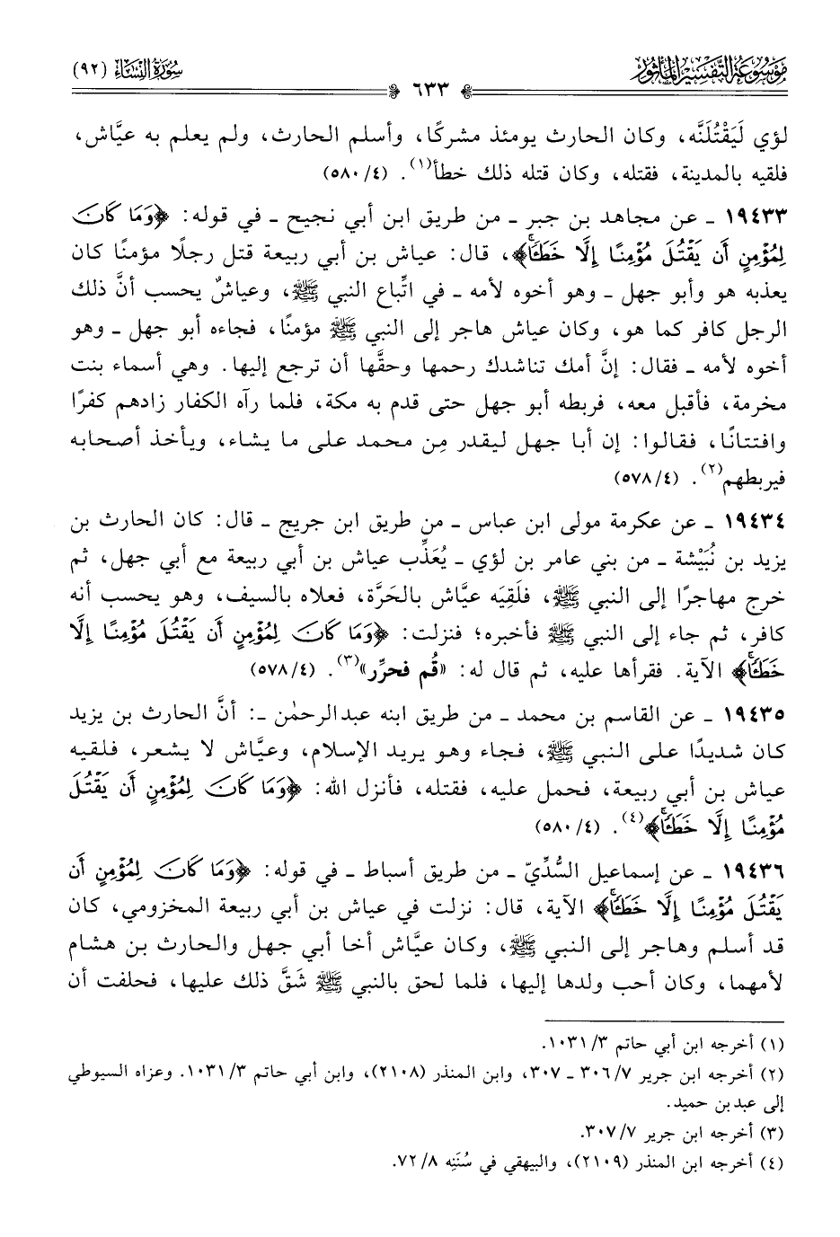 ١٩٤٣٤ - عن عكرمة مولى ابن عباس -من طريق ابن جريج- قال: كان الحارث بن يزيد بن نبيشة -من بني عامر بن لؤي- يُعَذِّب عياش بن أبي ربيعة مع أبي جهل، ثم خرج مهاجرًا إلى النبي - صلى الله عليه وسلم -، فلَقِيَه عيّاش بالحَرَّة، فعلاه بالسيف، وهو يحسب أنه كافر، ثم جاء إلى النبي - صلى الله عليه وسلم - فأخبره؛ فنزلت: {وما كان لمؤمن أن يقتل مؤمنا إلا خطأ} الآية. فقرأها عليه، ثم قال له: «قُم فحرِّر» (¬٣). (٤/ ٥٧٨)