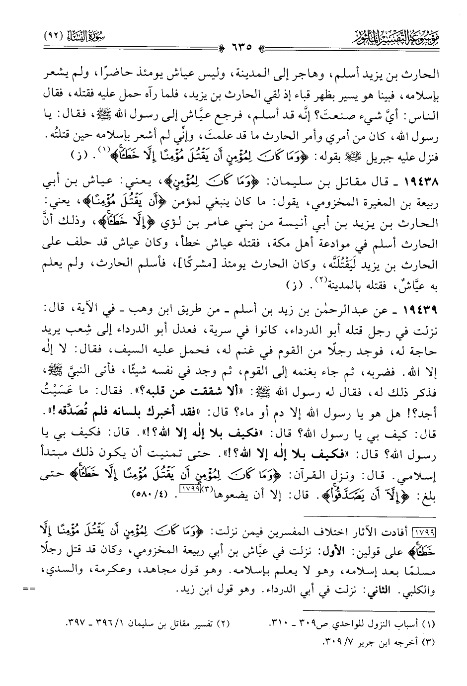 [١٧٩٩] أفادت الآثار اختلاف المفسرين فيمن نزلت: {وما كانَ لِمُؤْمِنٍ أنْ يَقْتُلَ مُؤْمِنًا إلا خَطَأً} على قولين: الأول: نزلت في عيّاش بن أبي ربيعة المخزومي، وكان قد قتل رجلًا مسلمًا بعد إسلامه، وهو لا يعلم بإسلامه. وهو قول مجاهد، وعكرمة، والسدي، والكلبي. الثاني: نزلت في أبي الدرداء. وهو قول ابن زيد.