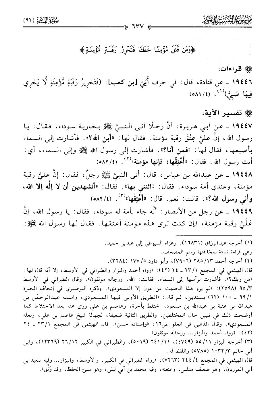 ١٩٤٤٦ - عن قتادة، قال: في حرف أُبَيّ [بن كعب]: (فَتَحْرِيرُ رَقَبَةٍ مُّؤْمِنَةٍ لّا يَجْرِي فِيها صَبِيٌّ) (¬١). (٤/ ٥٨١)