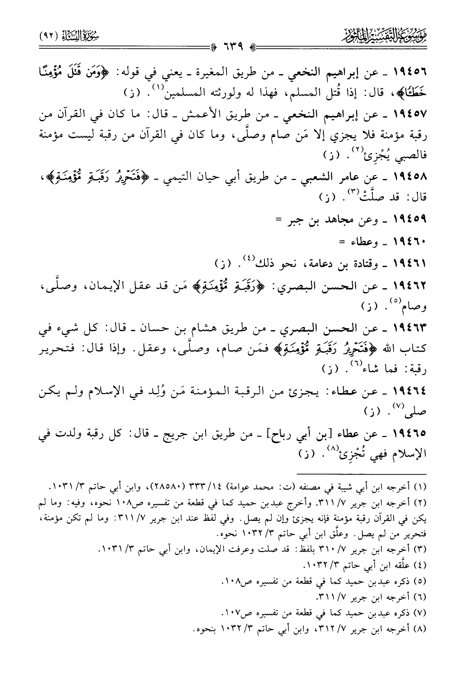 (¬٢) أخرجه ابن جرير ٧/ ٣١١. وأخرج عبد بن حميد كما في قطعة من تفسيره ص ١٠٨ نحوه، وفيه: وما لم يكن في القرآن رقبة مؤمنة فإنه يجزئ وإن لم يصل. وفي لفظ عند ابن جرير ٧/ ٣١١: وما لم تكن مؤمنة، فتحرير من لم يصل. وعلَّق ابن أبي حاتم ٣/ ١٠٣٢ نحوه.
