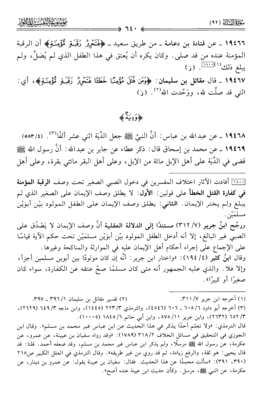 [١٨٠٠] أفادت الآثار اختلاف المفسرين في دخول الصبي الصغير تحت وصف الرقبة المؤمنة في كفارة القتل الخطأ على قولين: الأول: لا يطلق وصف الإيمان على الصغير الذي لم يبلغ ولم يختر الإيمان. الثاني: يطلق وصف الإيمان على الطفل المولود بيْن أبوَيْن مسلمَيْن. ورجَّح ابنُ جرير (٧/ ٣١٢) مستندًا إلى الدلالة العقلية أنّ وصف الإيمان لا يَصْدُق على الصبي غير البالغ، إلا أنه أدخل الطفل المولود بيْن أبوَيْن مسلمَيْن تحت حكم الآية قياسًا على الإجماع على إجراء أحكام أهل الإيمان عليه في الموارثة والمناكحة وغيرها.