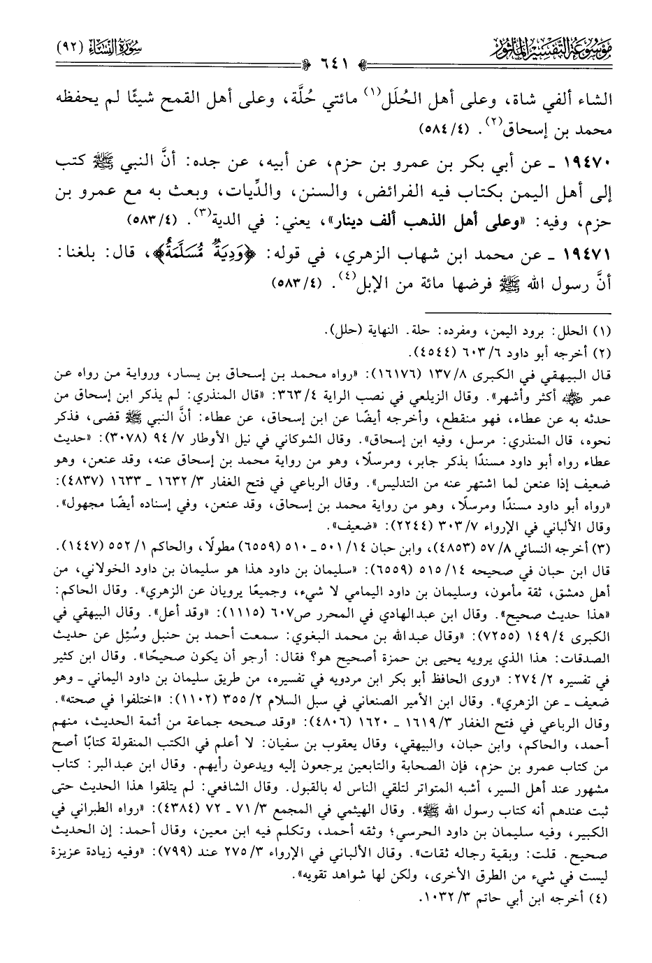 قال ابن حبان في صحيحه ١٤/ ٥١٥ (٦٥٥٩): «سليمان بن داود هذا هو سليمان بن داود الخولاني، من أهل دمشق، ثقة مأمون، وسليمان بن داود اليمامي لا شيء، وجميعًا يرويان عن الزهري». وقال الحاكم: «هذا حديث صحيح». وقال ابن عبد الهادي في المحرر ص ٦٠٧ (١١١٥): «وقد أعل». وقال البيهقي في الكبرى ٤/ ١٤٩ (٧٢٥٥): «وقال عبد الله بن محمد البغوي: سمعت أحمد بن حنبل وسُئِل عن حديث الصدقات: هذا الذي يرويه يحيى بن حمزة أصحيح هو؟ فقال: أرجو أن يكون صحيحًا». وقال ابن كثير في تفسيره ٢/ ٢٧٤: «روى الحافظ أبو بكر ابن مردويه في تفسيره، من طريق سليمان بن داود اليماني -وهو ضعيف- عن الزهري». وقال ابن الأمير الصنعاني في سبل السلام ٢/ ٣٥٥ (١١٠٢): «اختلفوا في صحته». وقال الرباعي في فتح الغفار ٣/ ١٦١٩ - ١٦٢٠ (٤٨٠٦): «وقد صححه جماعة من أئمة الحديث، منهم أحمد، والحاكم، وابن حبان، والبيهقي، وقال يعقوب بن سفيان: لا أعلم في الكتب المنقولة كتابًا أصح من كتاب عمرو بن حزم، فإن الصحابة والتابعين يرجعون إليه ويدعون رأيهم. وقال ابن عبد البر: كتاب مشهور عند أهل السير، أشبه المتواتر لتلقي الناس له بالقبول. وقال الشافعي: لم يتلقوا هذا الحديث حتى ثبت عندهم أنه كتاب رسول الله - صلى الله عليه وسلم -». وقال الهيثمي في المجمع ٣/ ٧١ - ٧٢ (٤٣٨٤): «رواه الطبراني في الكبير، وفيه سليمان بن داود الحرسي؛ وثقه أحمد، وتكلم فيه ابن معين، وقال أحمد: إن الحديث صحيح. قلت: وبقية رجاله ثقات». وقال الألباني في الإرواء ٣/ ٢٧٥ عند (٧٩٩): «وفيه زيادة عزيزة ليست في شيء من الطرق الأخرى، ولكن لها شواهد تقويه».