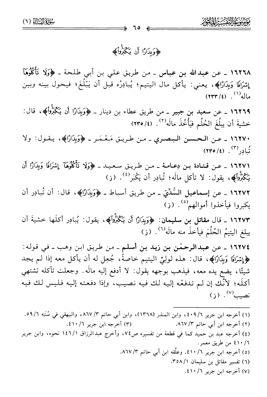 ١٦٢٦٨ - عن عبد الله بن عباس -من طريق علي بن أبي طلحة- {ولا تأكلوها إسرافا وبدارا}، يعني: يأكل مال اليتيم؛ يُبادِرُه قبل أن يَبْلُغَ؛ فيحول بينه وبين ماله (¬١). (٤/ ٢٣٣)