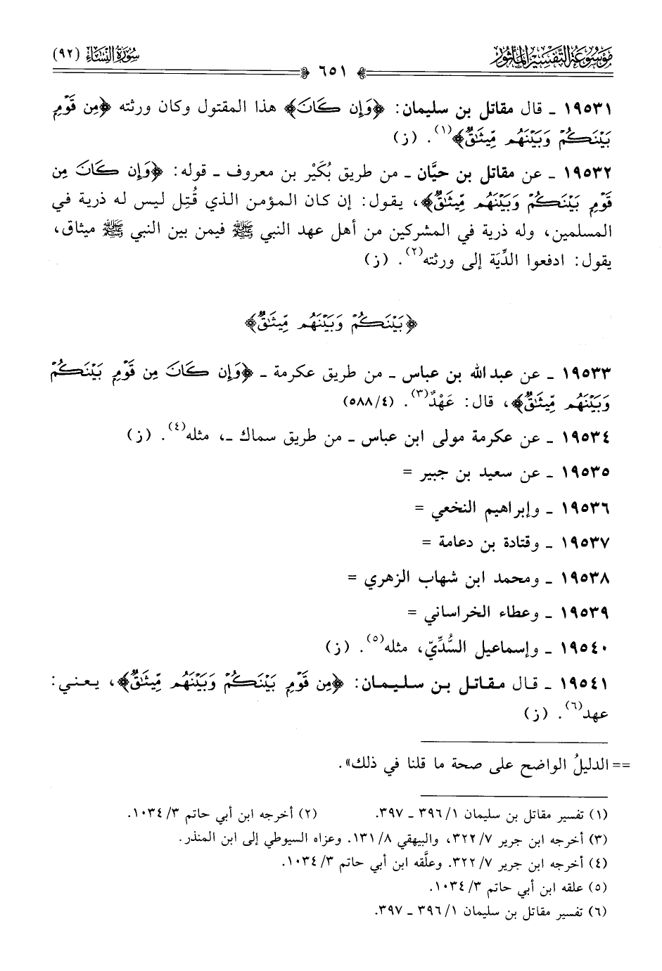 ١٩٥٣١ - قال مقاتل بن سليمان: {وإن كان} هذا المقتول وكان ورثته {من قوم بينكم وبينهم ميثاق} (¬١). (ز)
