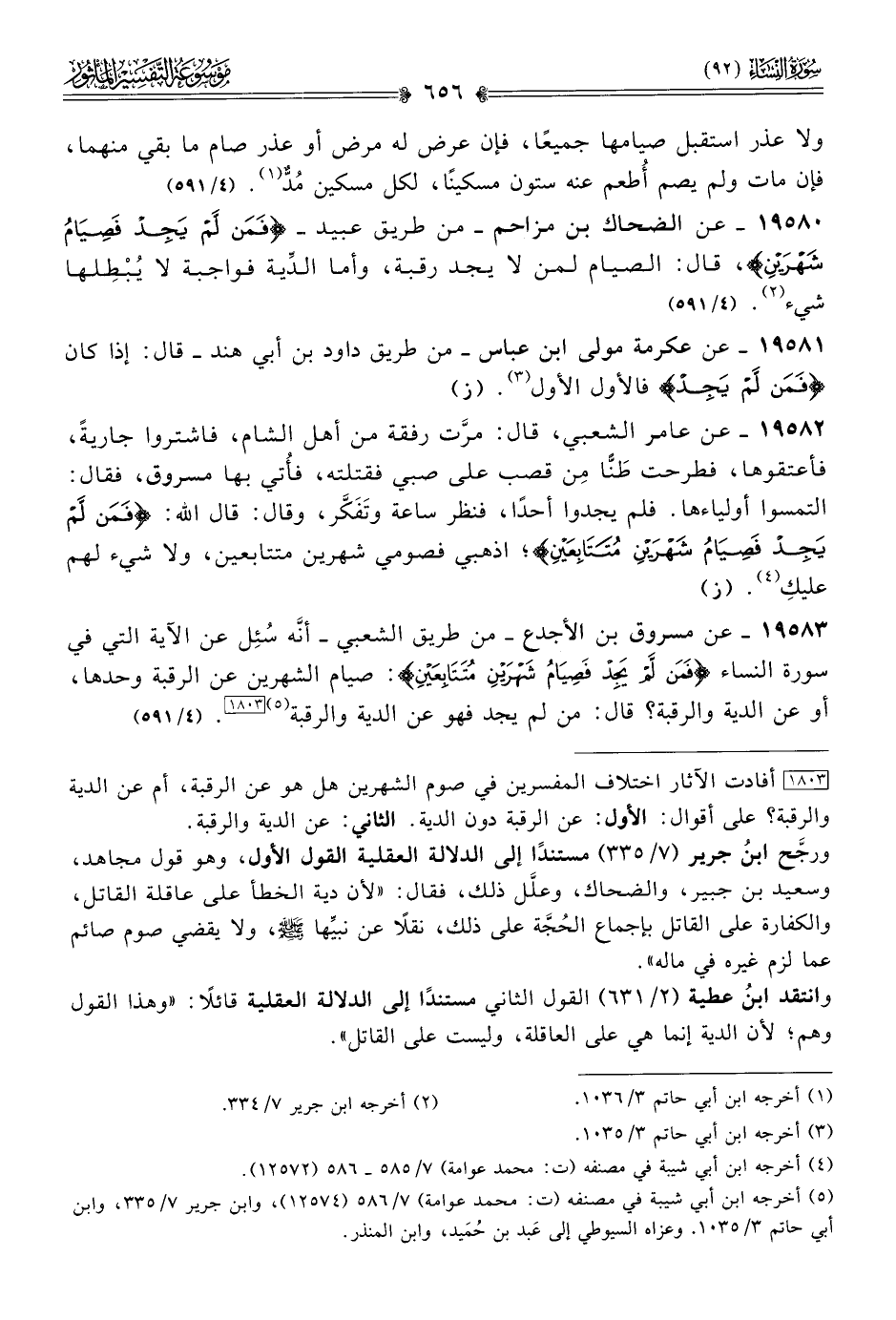 [١٨٠٣] أفادت الآثار اختلاف المفسرين في صوم الشهرين هل هو عن الرقبة، أم عن الدية والرقبة؟ على أقوال: الأول: عن الرقبة دون الدية. الثاني: عن الدية والرقبة.