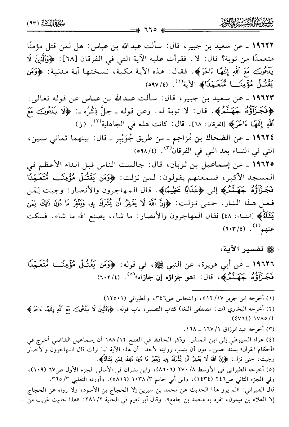 ١٩٦٢٢ - عن سعيد بن جبير، قال: سألت عبد الله بن عباس: هل لمن قتل مؤمنًا متعمدًا من توبة؟ قال: لا. فقرأت عليه الآية التي في الفرقان [٦٨]: {والذين لا يدعون مع الله إلها ءاخر}. فقال: هذه الآية مكية، نسختها آية مدنية: {ومن يقتل مؤمنا متعمدا} الآية (¬١). (٤/ ٥٩٧)